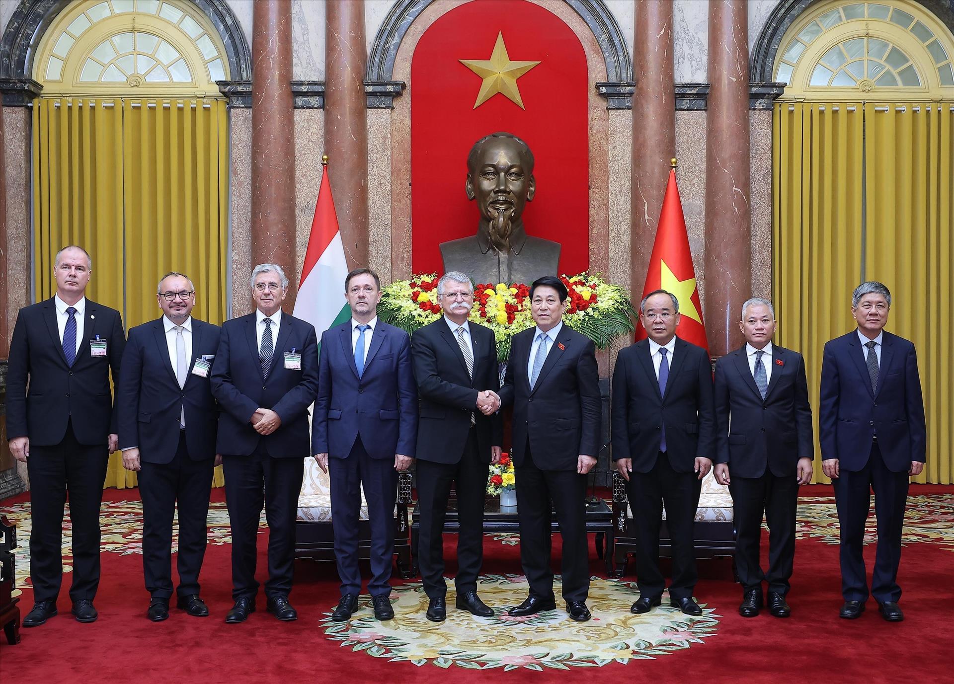 Chủ tịch nước Lương Cường với Chủ tịch Quốc hội Hungary Kover Laszlo và các đại biểu. Ảnh: Lâm Khánh - TTXVN