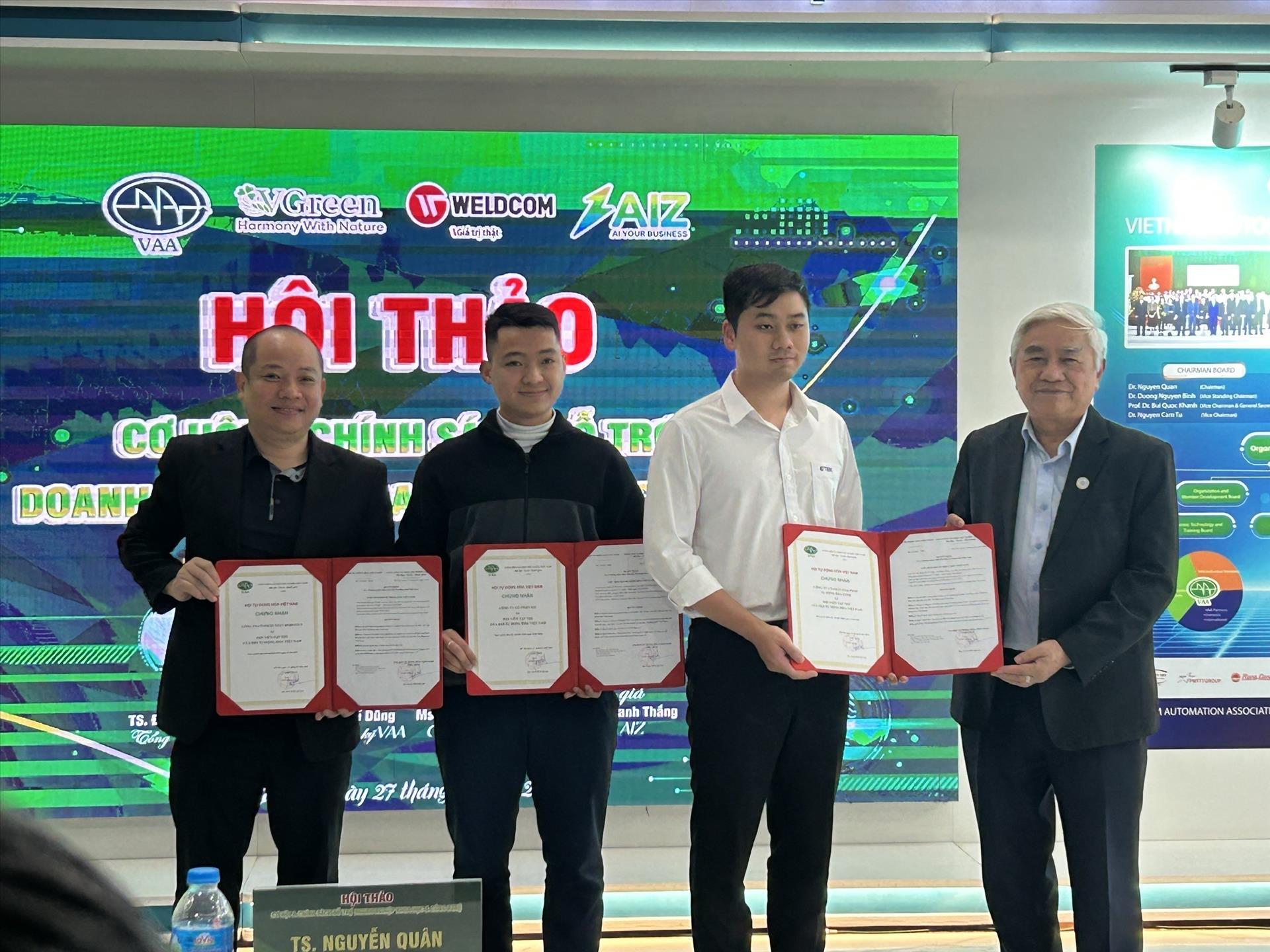 Tiến sĩ Nguyễn Quân, Chủ tịch Hội Tự động hóa Việt Nam trao chứng nhận cho các doanh nghiệp hội viên mới tham gia Hệ sinh thái doanh nghiệp Hội Tự động hóa Việt Nam. Ảnh: Diệu Thúy - TTXVN
