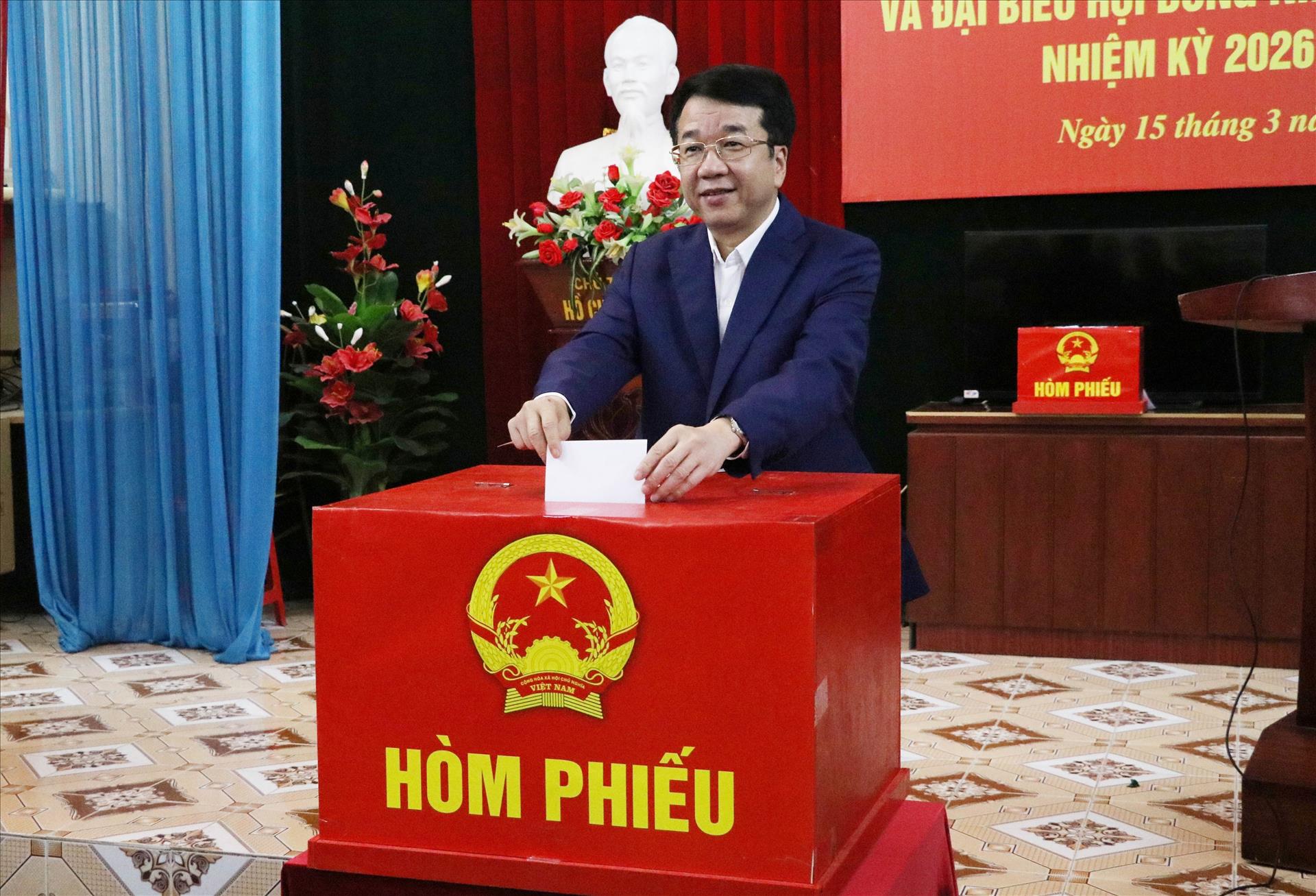 Ông Nguyễn Thanh Bình, Phó Bí thư Tỉnh ủy, Chủ tịch UBND tỉnh Ninh Bình bỏ phiếu tại Khu vực bỏ phiếu số 27, phường Hoa Lư, tỉnh Ninh Bình. Ảnh: Hải Yến - TTXVN