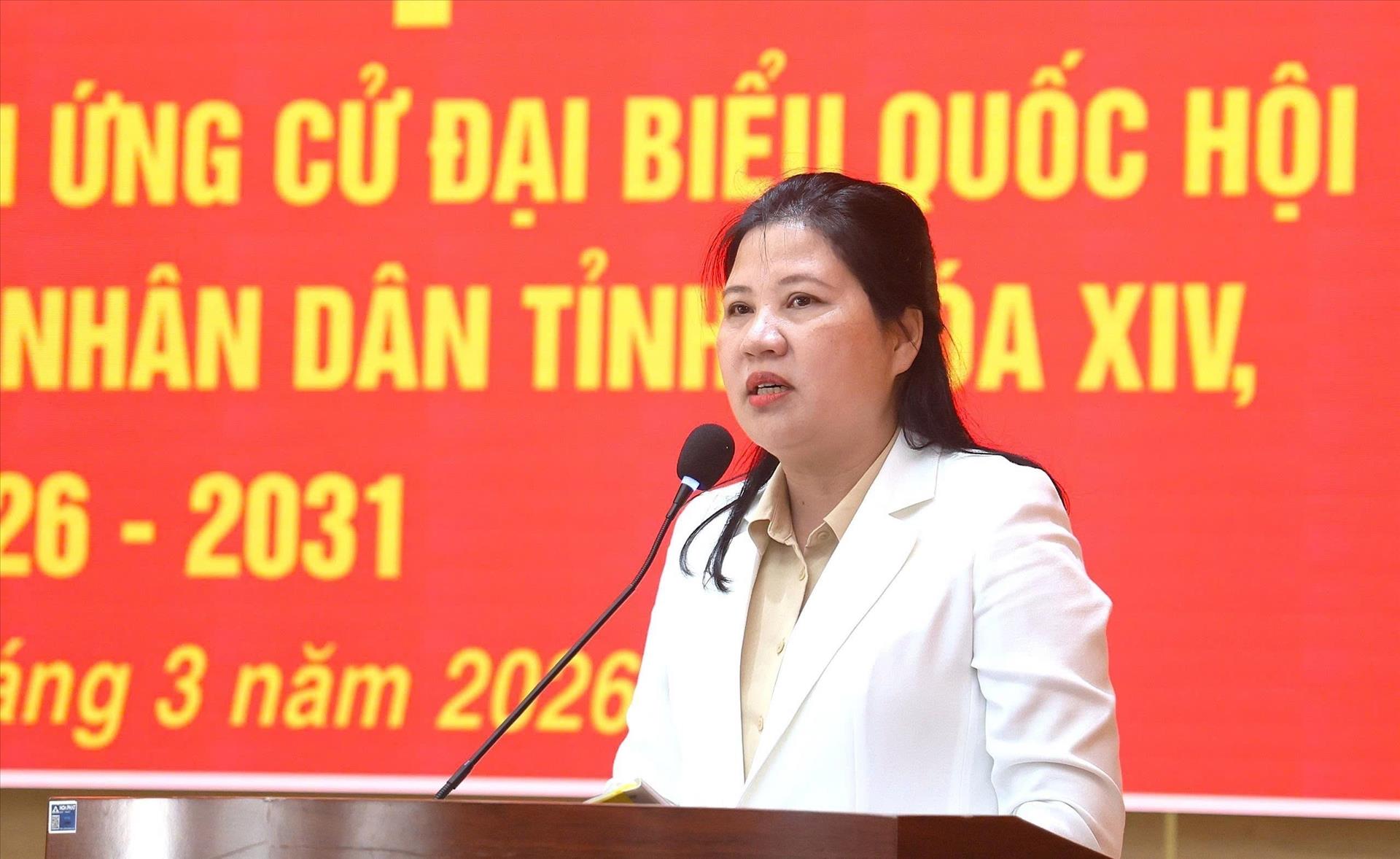 Bà Hà Thị Anh Thư, Phó Trưởng Ban Tuyên giáo và Dân vận tỉnh Quảng Ngãi trình bày chương trình hành động trước cử tri đặc khu Lý Sơn. Ảnh: TTXVN phát