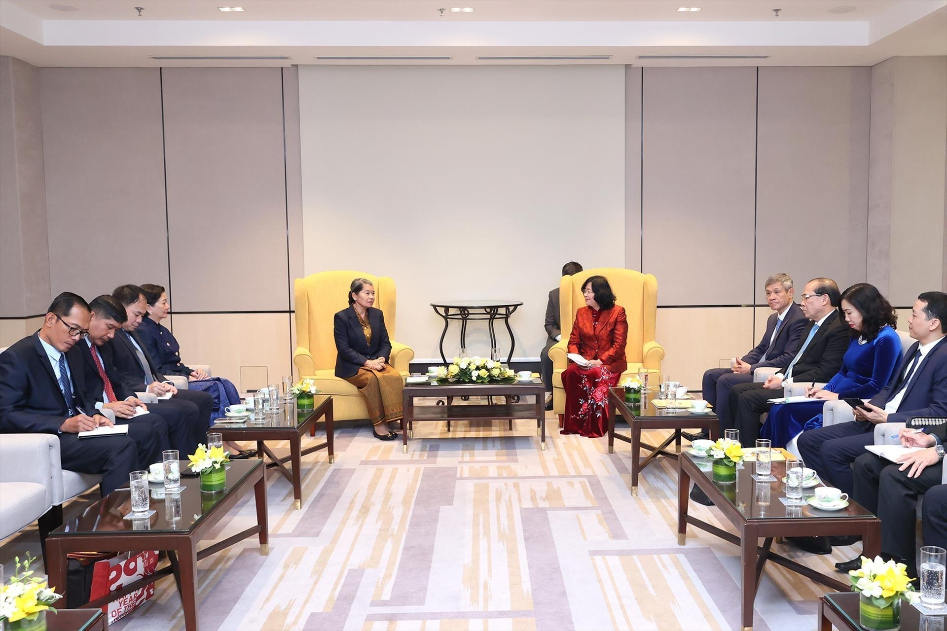 Chủ tịch Ủy ban Trung ương Mặt trận Tổ quốc Việt Nam Bùi Thị Minh Hoài tiếp đồng chí Men Sam An, Phó Chủ tịch Đảng Nhân dân Campuchia, Chủ tịch Hội đồng quốc gia Mặt trận Đoàn kết và Phát triển Tổ quốc Campuchia. Ảnh: An Đăng - TTXVN