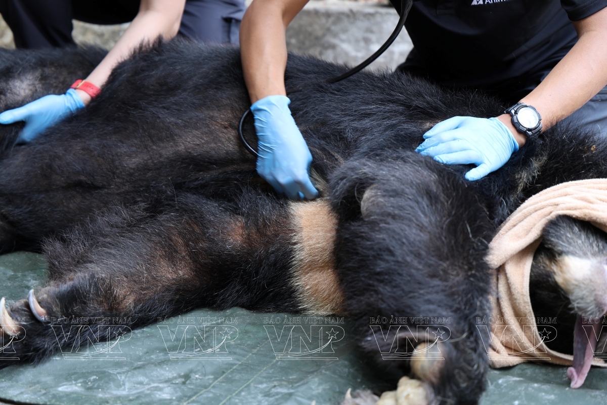 Các bác sĩ thú y thăm khám sức khỏe ban đầu cho gấu sau khi gây mê. Ảnh: Công Đạt/Báo ảnh Việt Nam