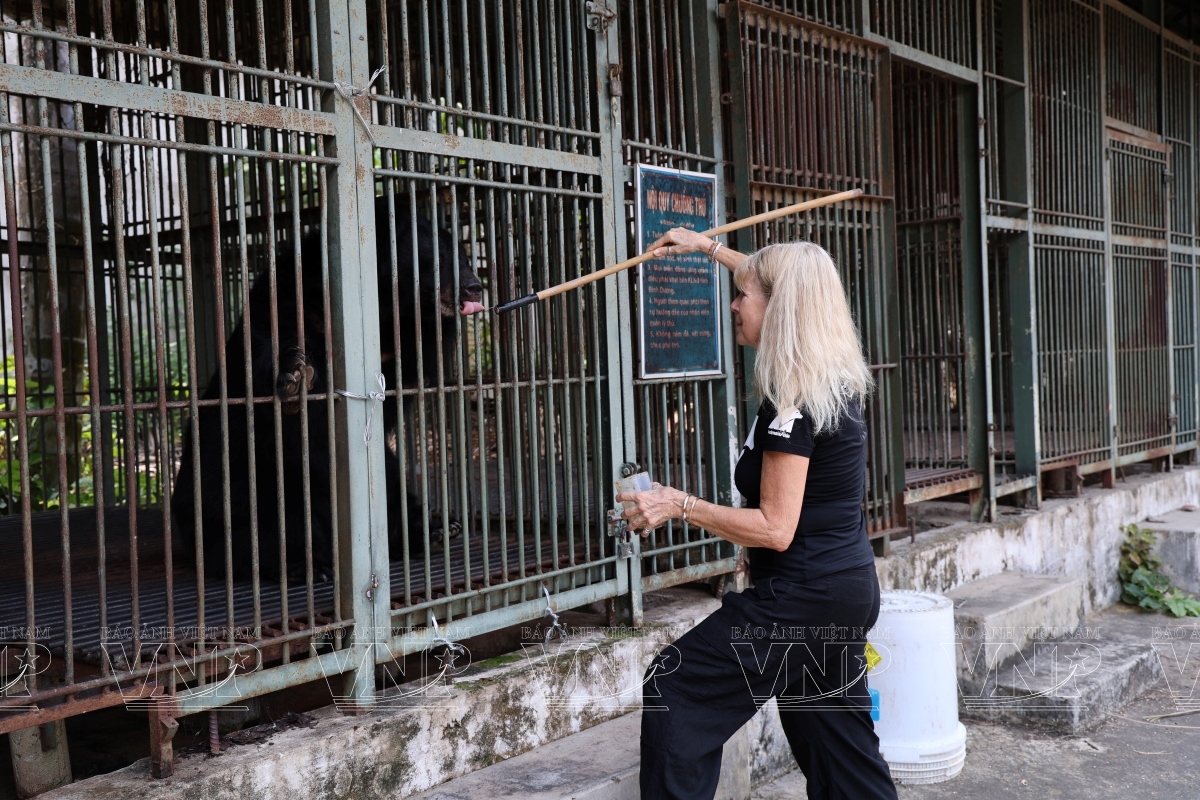 Bà Jill Robinson, Nhà sáng lập, Tổng Giám đốc Tổ chức Động vật Châu Á, đang cho gấu ăn mật ong để giúp chúng trở nên bình tĩnh sẽ khiến việc cứu hộ được dễ dàng hơn. Ảnh: Công Đạt/Báo ảnh Việt Nam