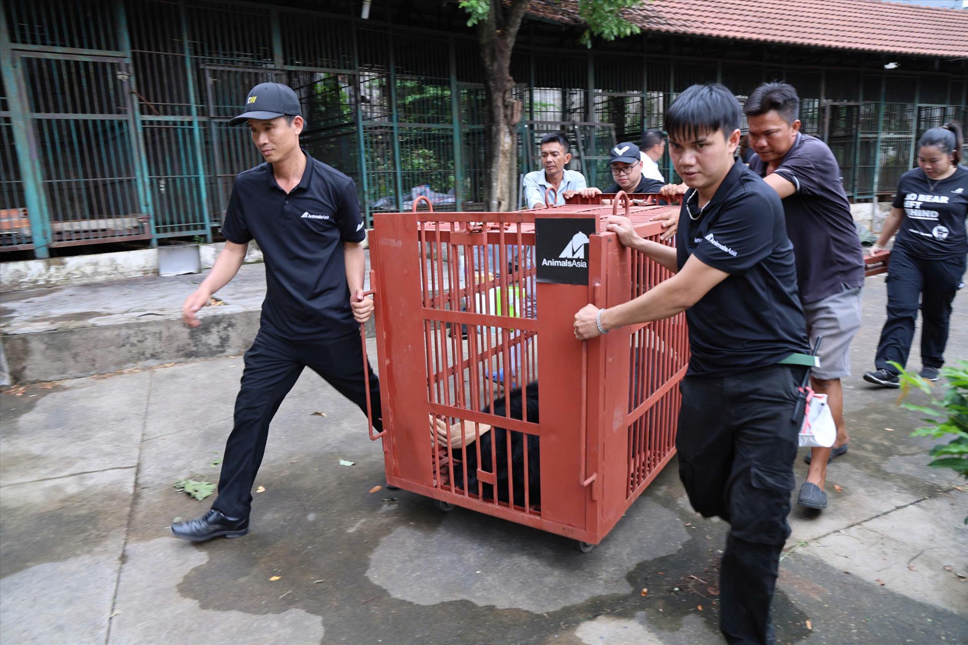 Các cá thể gấu được đưa ra xe để di chuyển về Trung tâm Cứu hộ Gấu Việt Nam thuộc VQG Bạch Mã, Huế. Ảnh: Công Đạt/Báo ảnh Việt Nam