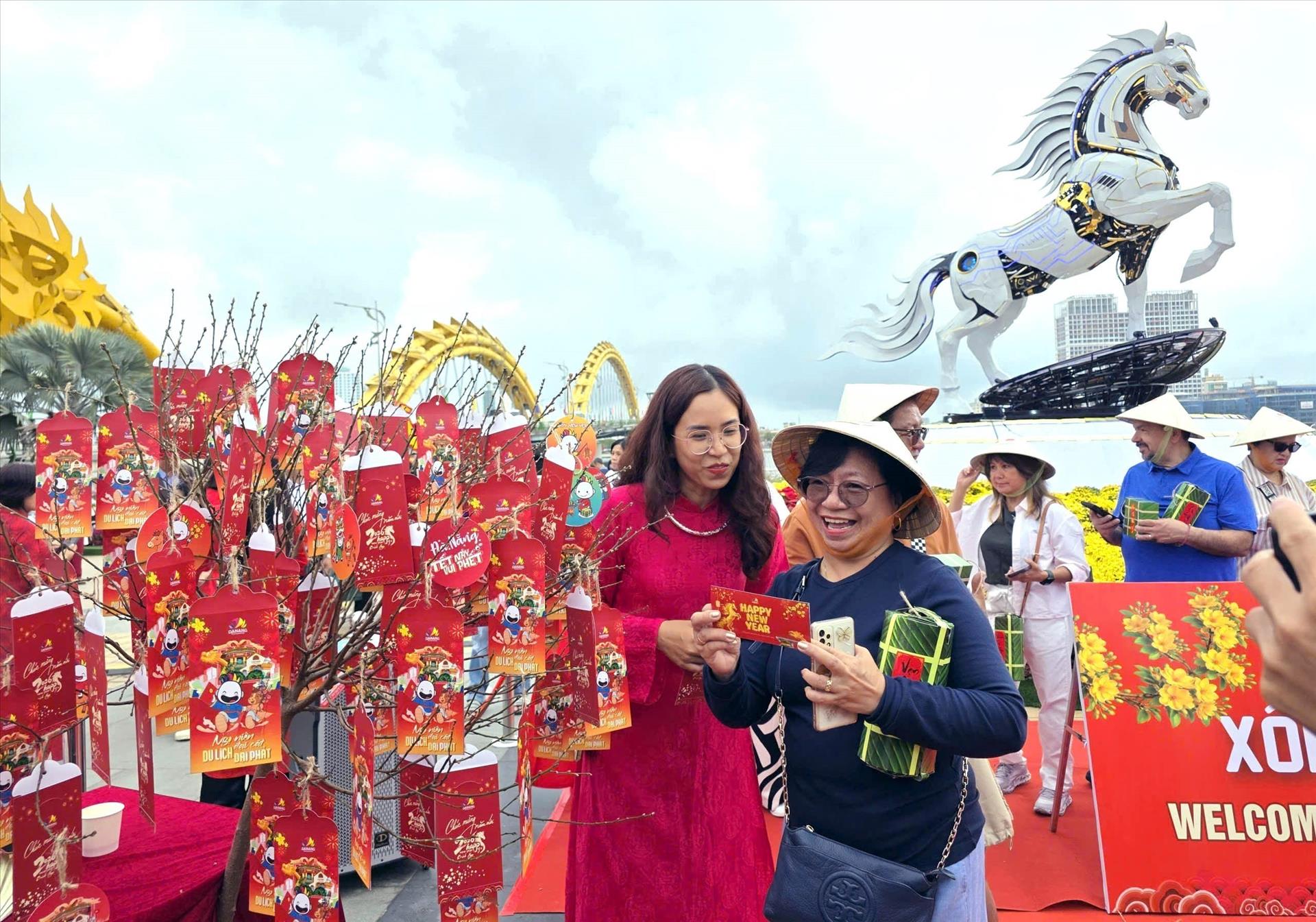 Tại khuôn viên phía Nam cầu Rồng, chương trình diễn ra sôi nổi với các tiết mục múa lân sư rồng, tạo không khí hân hoan trong những giờ phút đầu năm. Du khách được tặng quà lưu niệm, lì xì đầu xuân, tham gia hái lộc và tham quan không gian đường hoa rực rỡ. Nhiều hoạt động tái hiện nét đẹp Tết truyền thống cũng được tổ chức, mang đến không khí Xuân ấm áp, thân thiện.