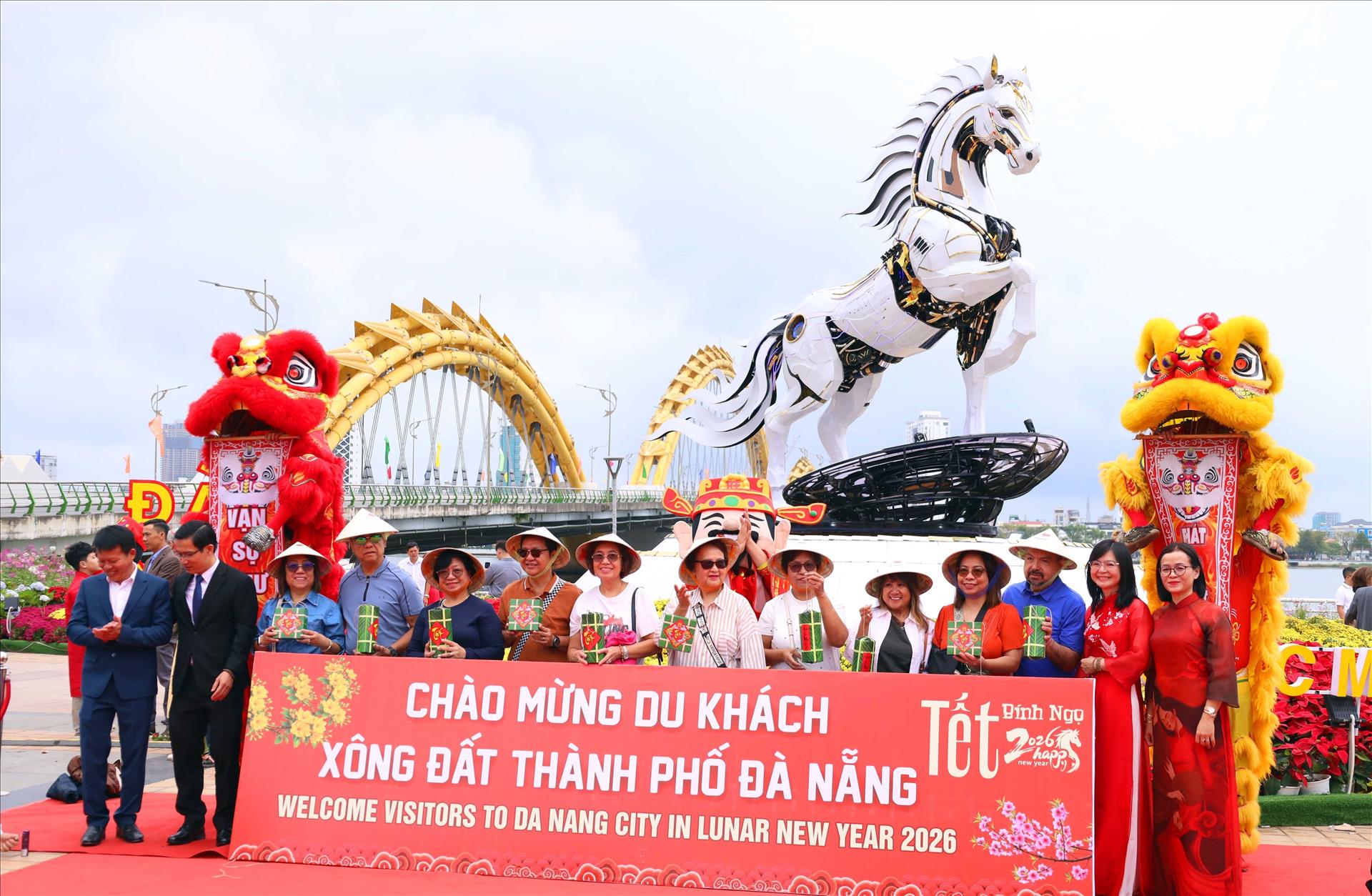 Sáng 17/2 (tức mùng 1 Tết), Sở Văn hóa, Thể thao và Du lịch thành phố Đà Nẵng phối hợp với các đơn vị liên quan tổ chức chương trình “Khai xuân Du lịch Xuân Bính Ngọ 2026” và “Chào đón du khách xông đất thành phố Đà Nẵng Tết Bính Ngọ 2026” tại khuôn viên phía Nam cầu Rồng và Cảng hàng không quốc tế Đà Nẵng.