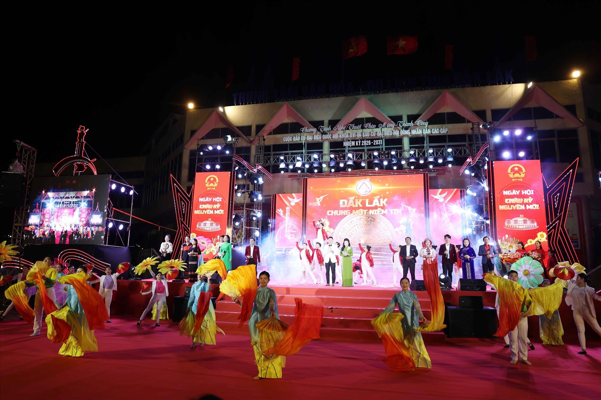 Chào mừng thành công cuộc bầu cử đại biểu Quốc hội khóa XVI và đại biểu Hội đồng nhân dân các cấp nhiệm kỳ 2026 - 2031, tối 16/3, Sở Văn hóa, Thể thao và Du lịch tỉnh Đắk Lắk tổ chức chương trình nghệ thuật “Đắk Lắk - Chung một niềm tin”. Chương trình diễn ra tại hai địa điểm: Trung tâm Văn hóa - Du lịch tỉnh, phường Buôn Ma Thuột (khu vực phía Tây tỉnh) và Quảng trường Phú Yên, phường Tuy Hòa (khu vực phía Đông tỉnh).