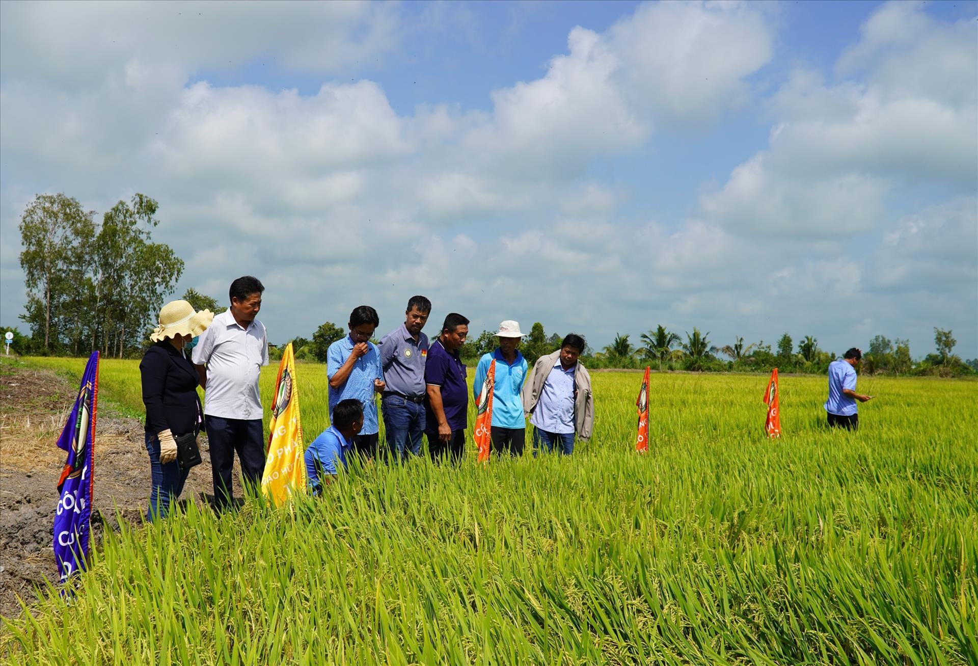Các đại biểu tham qua mô hình trình diễn giống lúa TNN91. Ảnh: Văn Sĩ - TTXVN