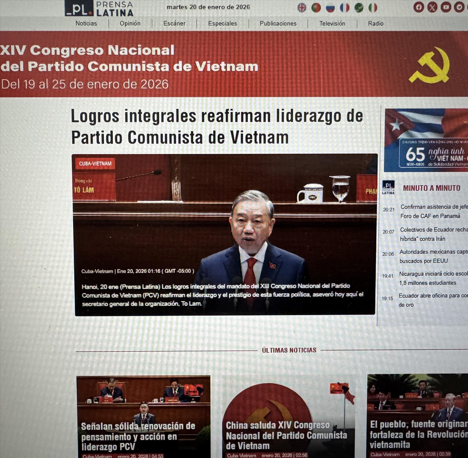 Hãng thông tấn Mỹ Latinh Prensa Latina của Cuba đưa tin về Đại hội XIV của Đảng Cộng sản Việt Nam. Ảnh chụp màn hình: Việt Hùng-P/v TTXVN tại Cuba