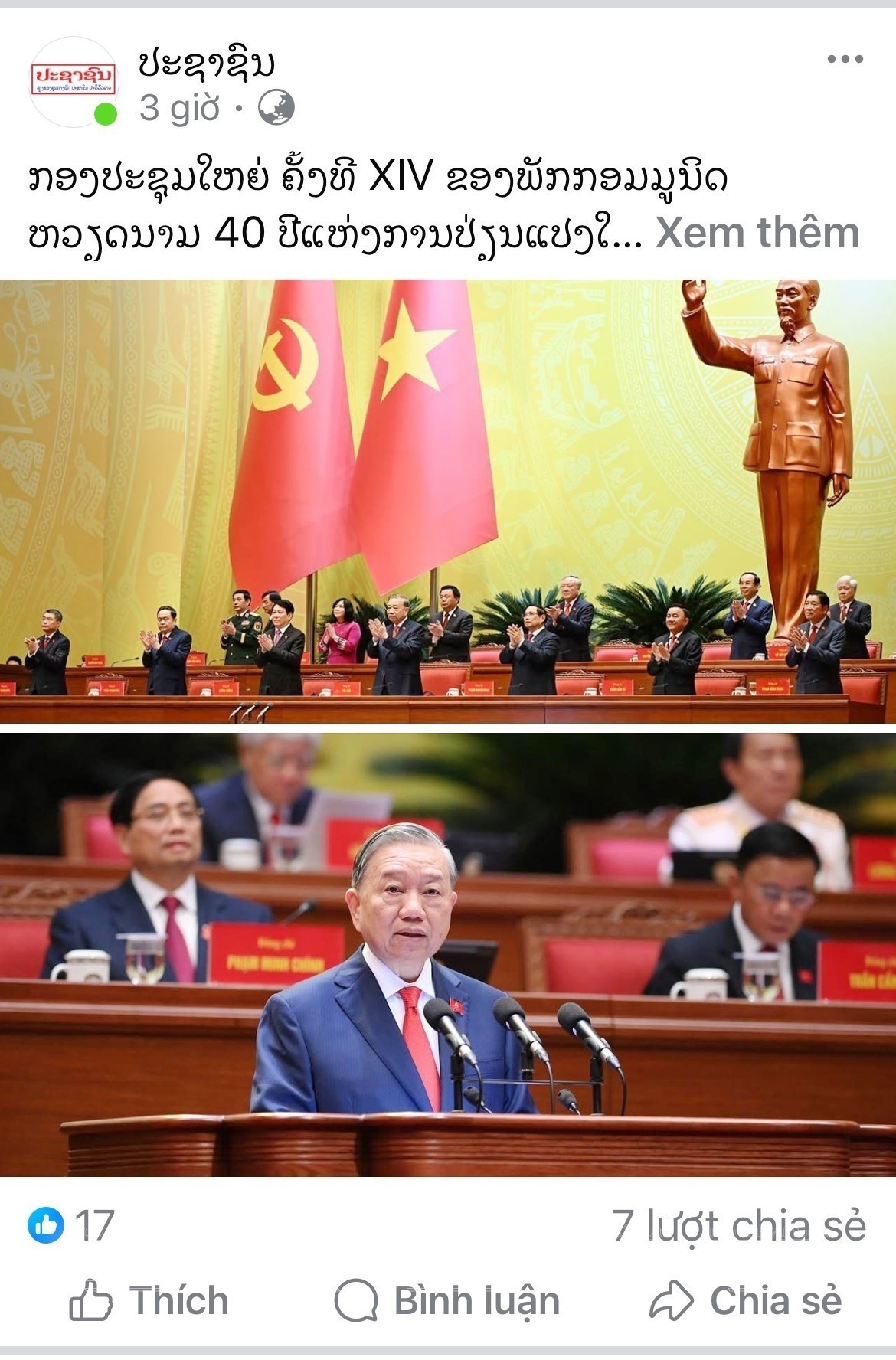 Với sự chuẩn bị chu đáo, sự đồng thuận cao giữa ý Đảng và lòng dân, Đại hội Đại biểu toàn quốc lần thứ XIV (Đại hội XIV) của Đảng Cộng sản Việt Nam sẽ đưa ra những quyết sách quan trọng mang tính thời đại, lãnh đạo đất nước tiến lên mục tiêu dân giàu, nước mạnh, dân chủ, công bằng, văn minh và hạnh phúc. Đây là lời khẳng định trong bài xã luận “Đại hội lần thứ XIV của Đảng Cộng sản Việt Nam, dấu mốc 40 năm Đổi mới” trên trang điện tử của báo Pasaxon, cơ quan ngôn luận của Đảng Nhân dân cách mạng Lào, số ra ngày 21/1.
