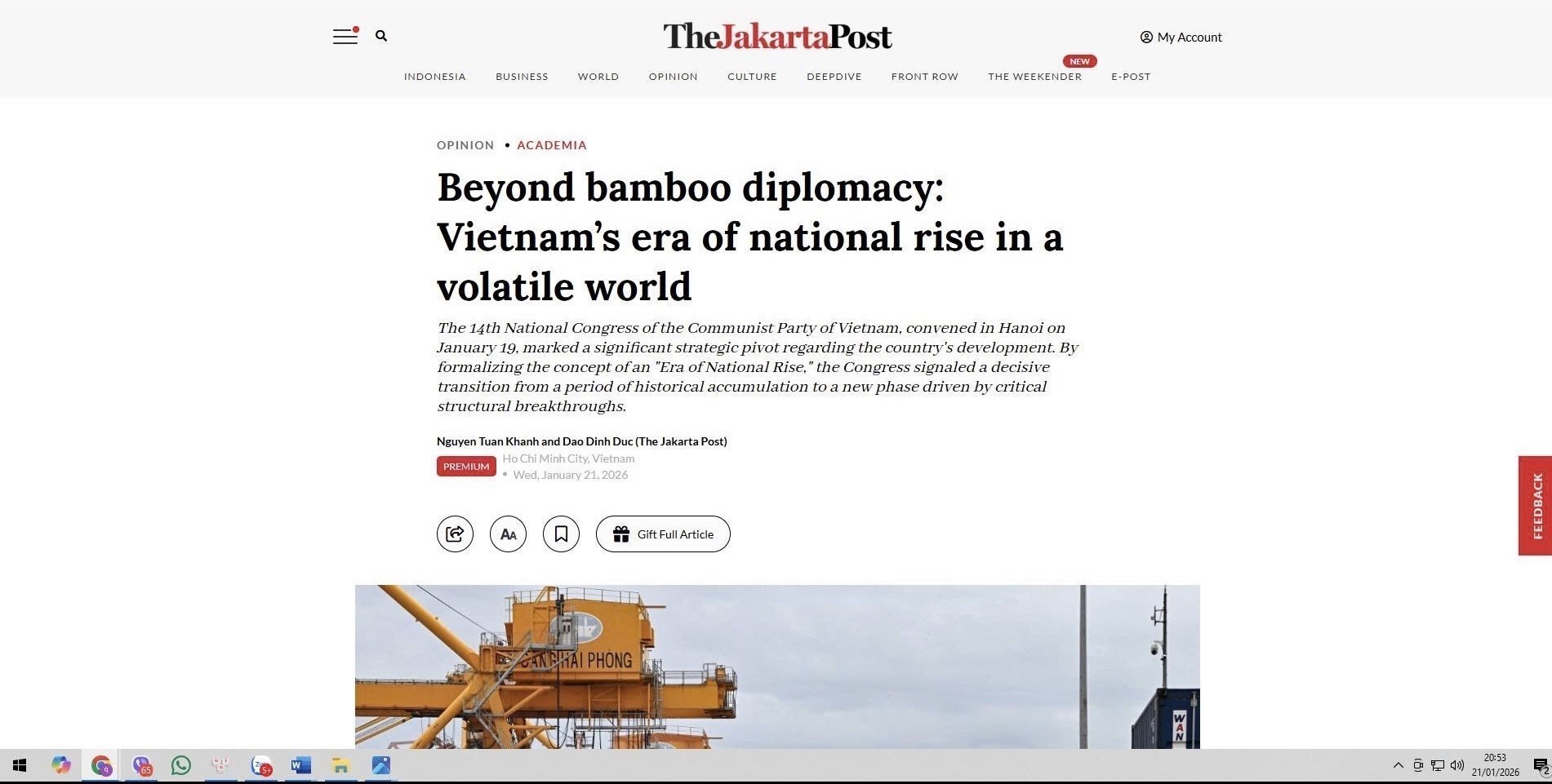 Bài báo đăng trên Jakarta Post ngày 21/1. Ảnh chụp màn hình: Đỗ Quyên – PV TTXVN tại Indonesia