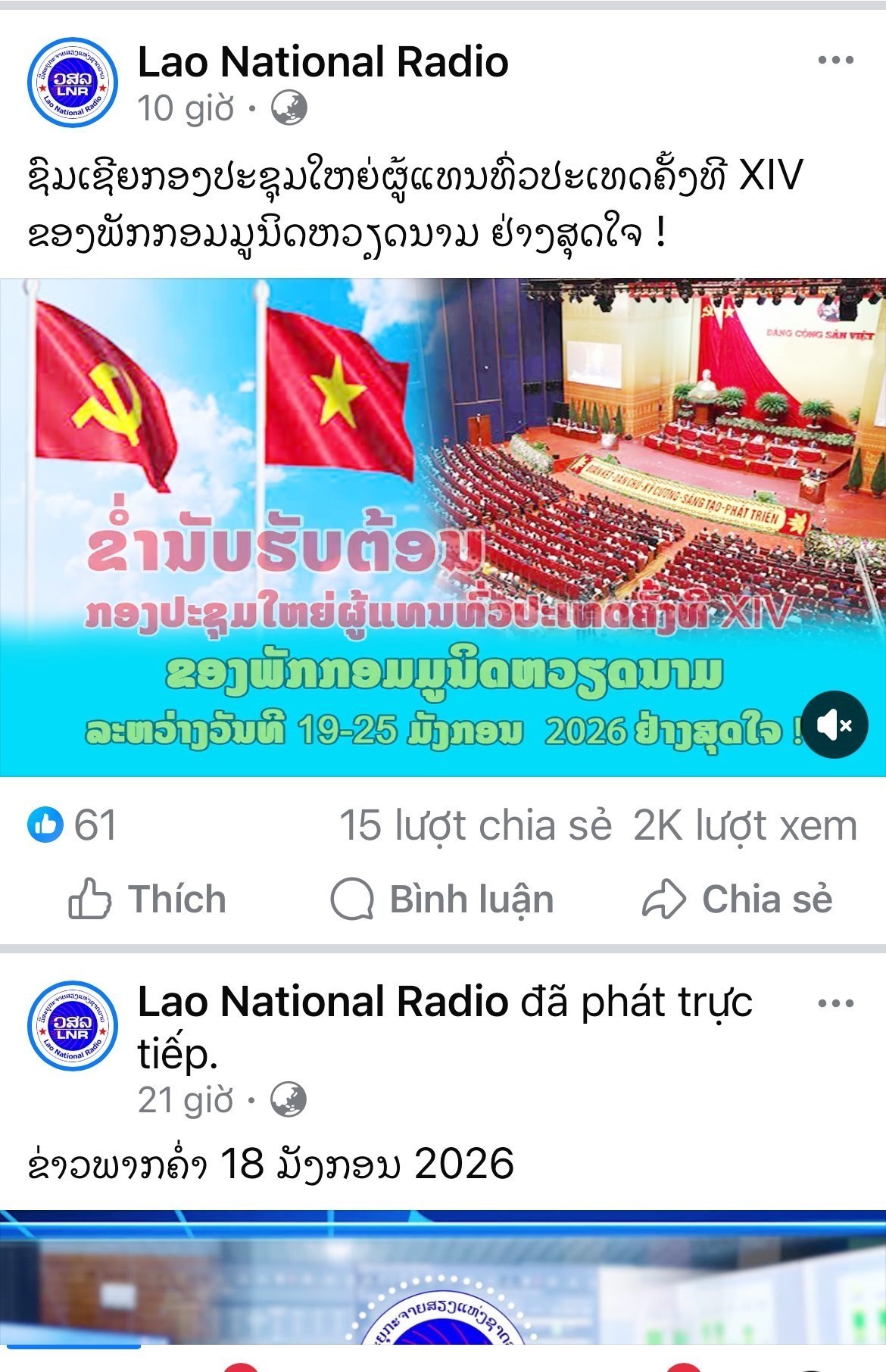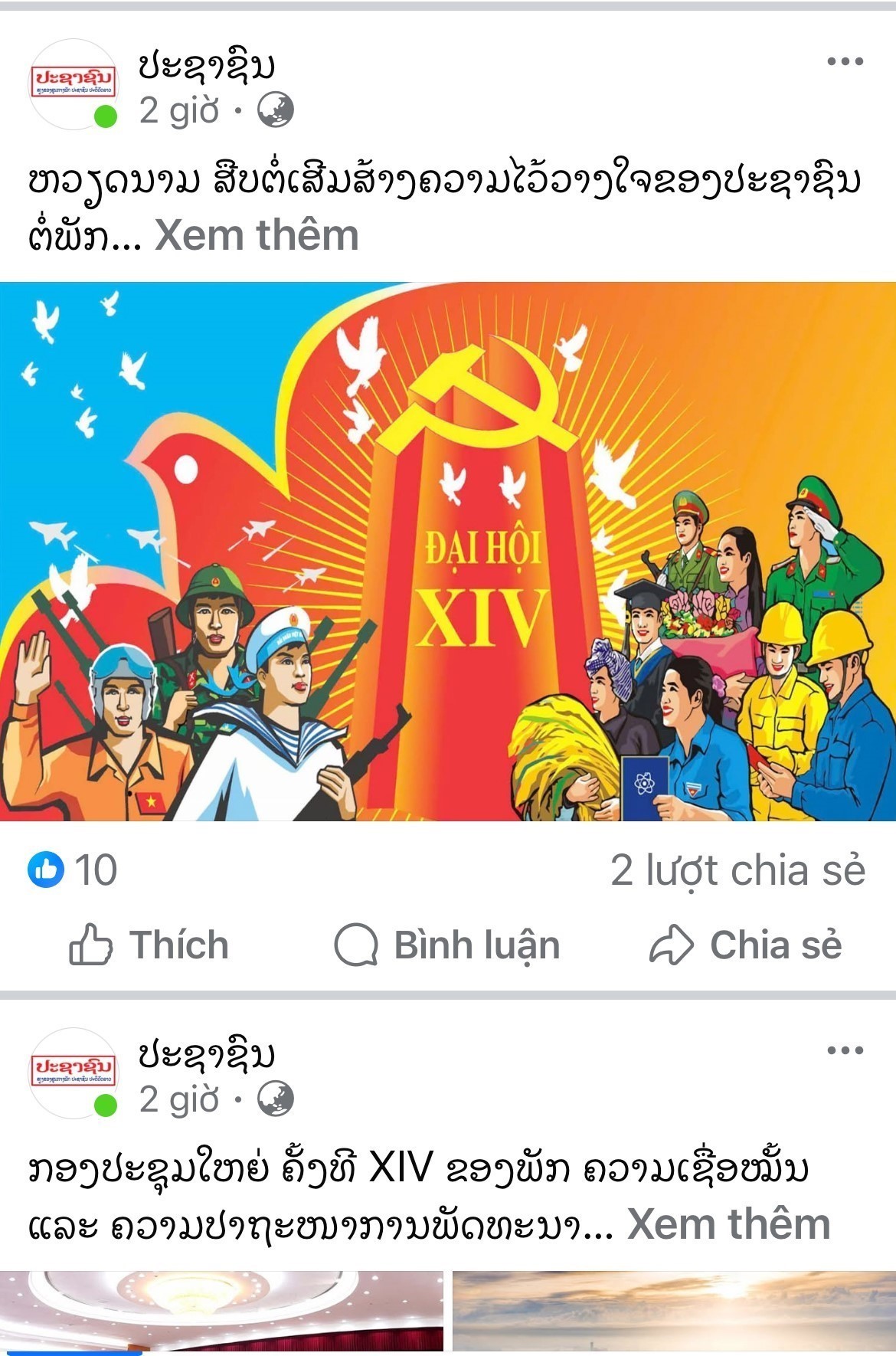 Theo phóng viên TTXVN tại Lào, ngày 19/1, trên trang mạng các kênh truyền thông chính thống của Lào như báo Pasaxon, Cơ quan ngôn luận của Đảng Nhân dân Cách mạng Lào; Thông tấn xã Lào; Đài phát thanh quốc gia Lào; báo Công an Lào… đồng loạt đưa tin đậm nét về Đại hội Đại biểu toàn quốc lần thứ XIV (Đại hội XIV) của Đảng Cộng sản Việt Nam.