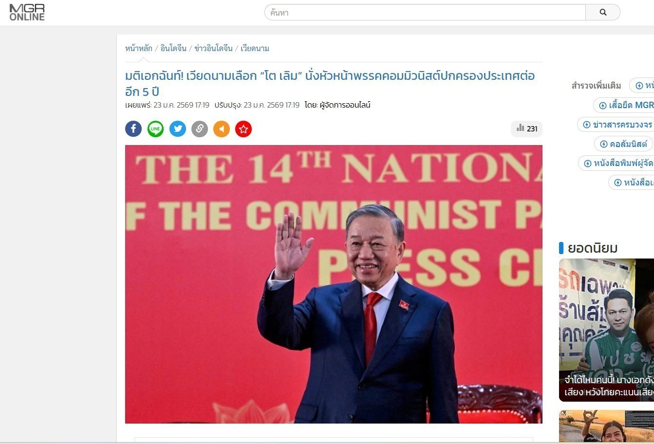 Ngoài ra, nhiều hãng truyền thông lớn khác của Thái Lan cũng đưa tin về Đại hội XIV của Đảng Cộng sản Việt Nam. Trang thairath.co.th ngày 20/1 đăng bài “Tổng Bí thư Tô Lâm tuyên bố mục tiêu tăng trưởng GDP 10% mỗi năm cho Việt Nam”. Trang mạng pptvhd36.com ngày 20/1 cũng có bài “Việt Nam đặt mục tiêu tăng trưởng kinh tế 10% mỗi năm đến năm 2030”. Trang mạng dailynews.co.th ngày 23/1 đăng bài “Đảng Cộng sản Việt Nam nhất trí bầu đồng chí Tô Lâm làm Tổng Bí thư thêm 5 năm”; và bangkokpost.com (23/1) đăng bài “Các nhà đầu tư hoan nghênh cải cách kinh tế của Việt Nam khi Tổng Bí thư Tô Lâm được tái bổ nhiệm”.