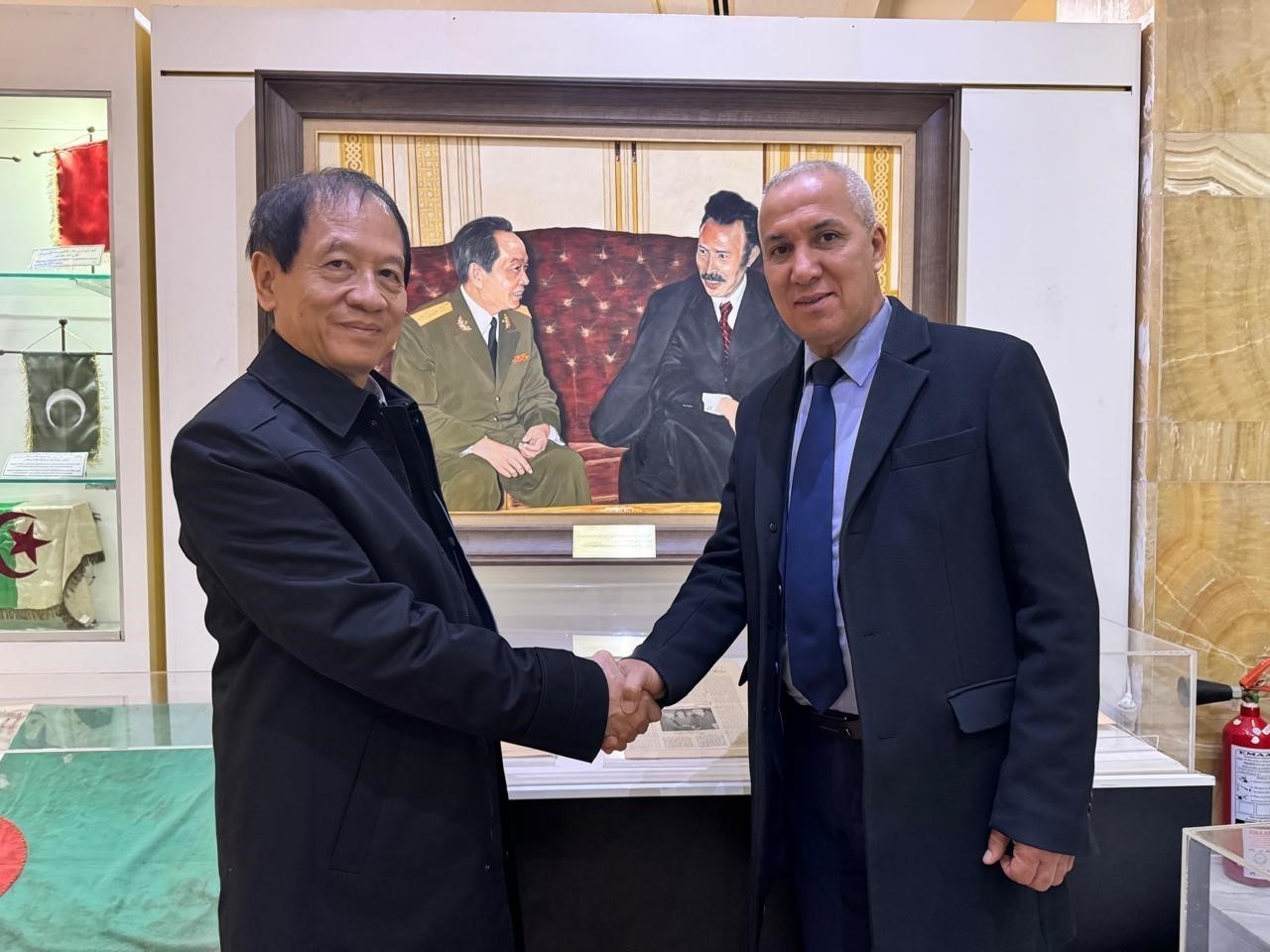 Tranh Đại tướng Võ Nguyên Giáp gặp Tổng thống Houari Boumediene - quà tặng của Thủ tướng Phạm Minh Chính cho bảo tàng Moujahid - được trưng bày ở vị trí trang trọng. Ảnh: Nguyễn An - PV TTXVN tại Algeria