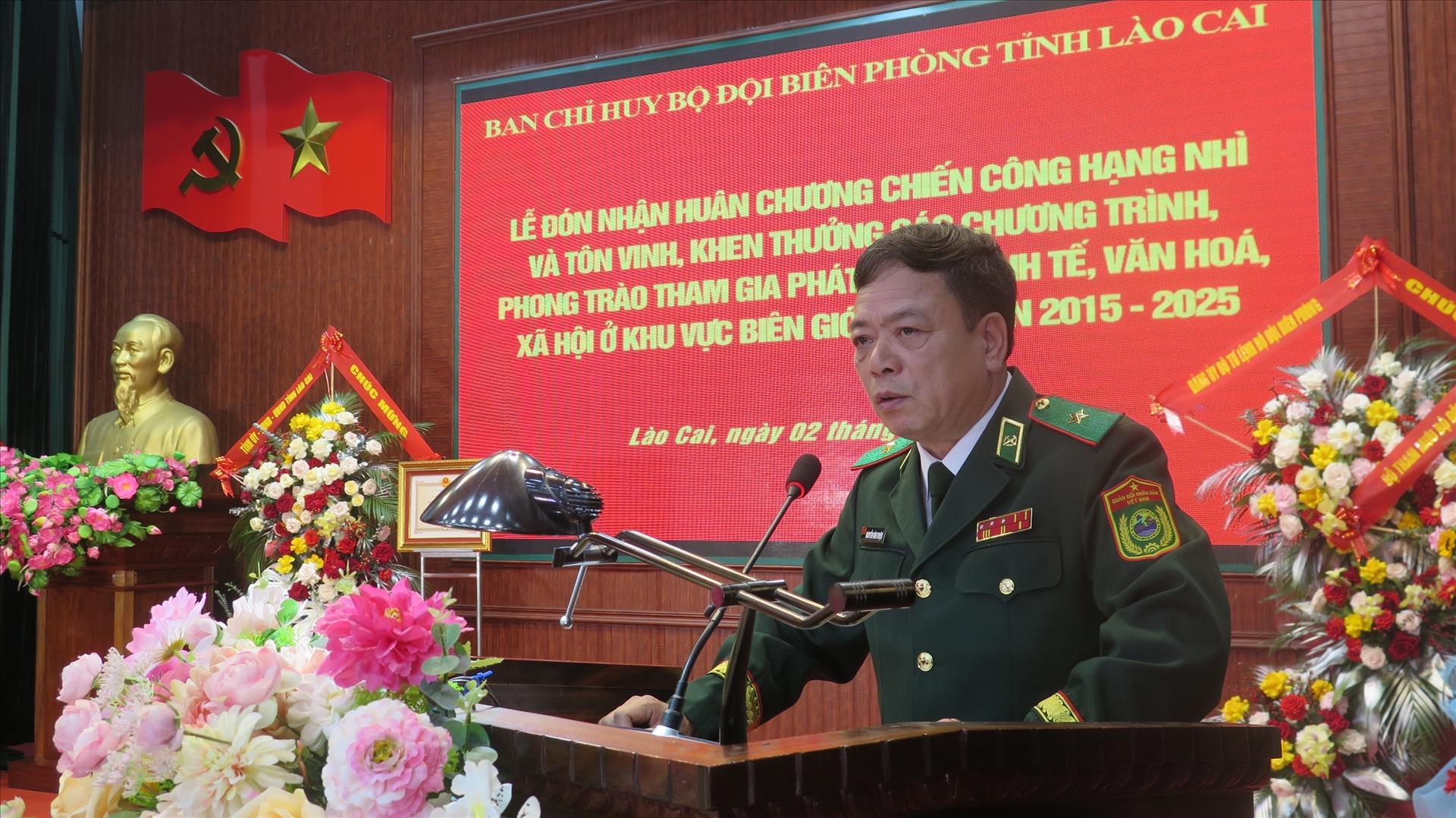 Phó Chủ tịch UBND tỉnh Lào Cai Nguyễn Thành Sinh biểu dương và chúc mừng những kết quả mà lực lượng Bộ đội Biên phòng tỉnh Lào Cai đạt được trong 10 năm qua đồng thời đề nghị đơn vị cần tiếp tục gắn nhiệm vụ phát triển kinh tế - xã hội với củng cố quốc phòng, an ninh và đối ngoại Biên phòng; lấy ổn định an ninh, trật tự làm nền tảng cho phát triển, thông qua phát triển kinh tế - xã hội để tăng cường tiềm lực quốc phòng, an ninh, xây dựng thế trận lòng dân vững chắc.