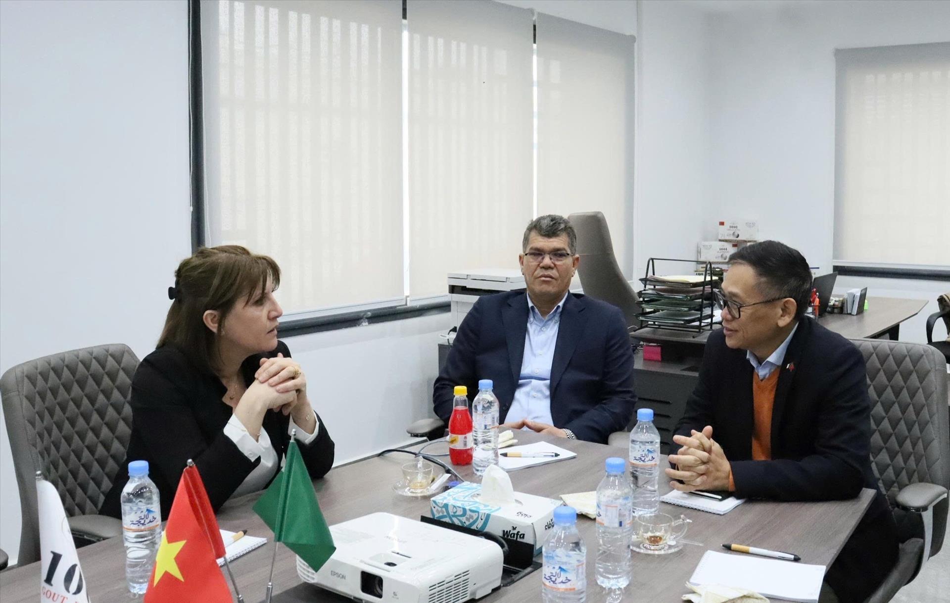 Đại sứ Việt Nam tại Algeria Trần Quốc Khánh trao đổi với đại diện Công ty NTH Agro về tiềm năng hợp tác với các doanh nghiệp xuất khẩu nông sản của Việt Nam. Ảnh: Mạnh Hùng – PV TTXVN tại Algeria