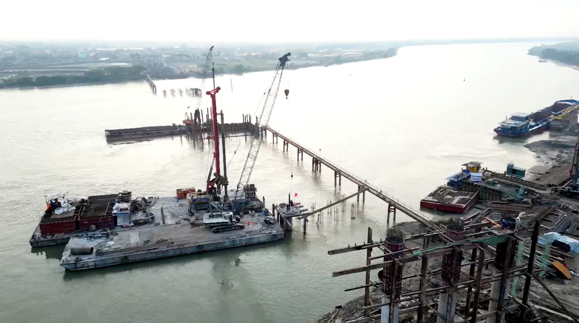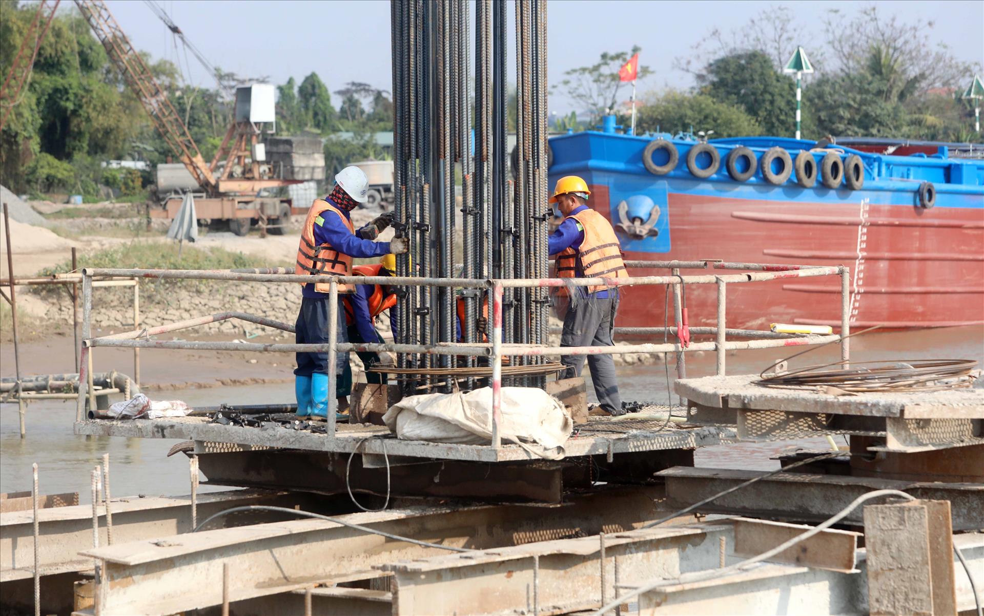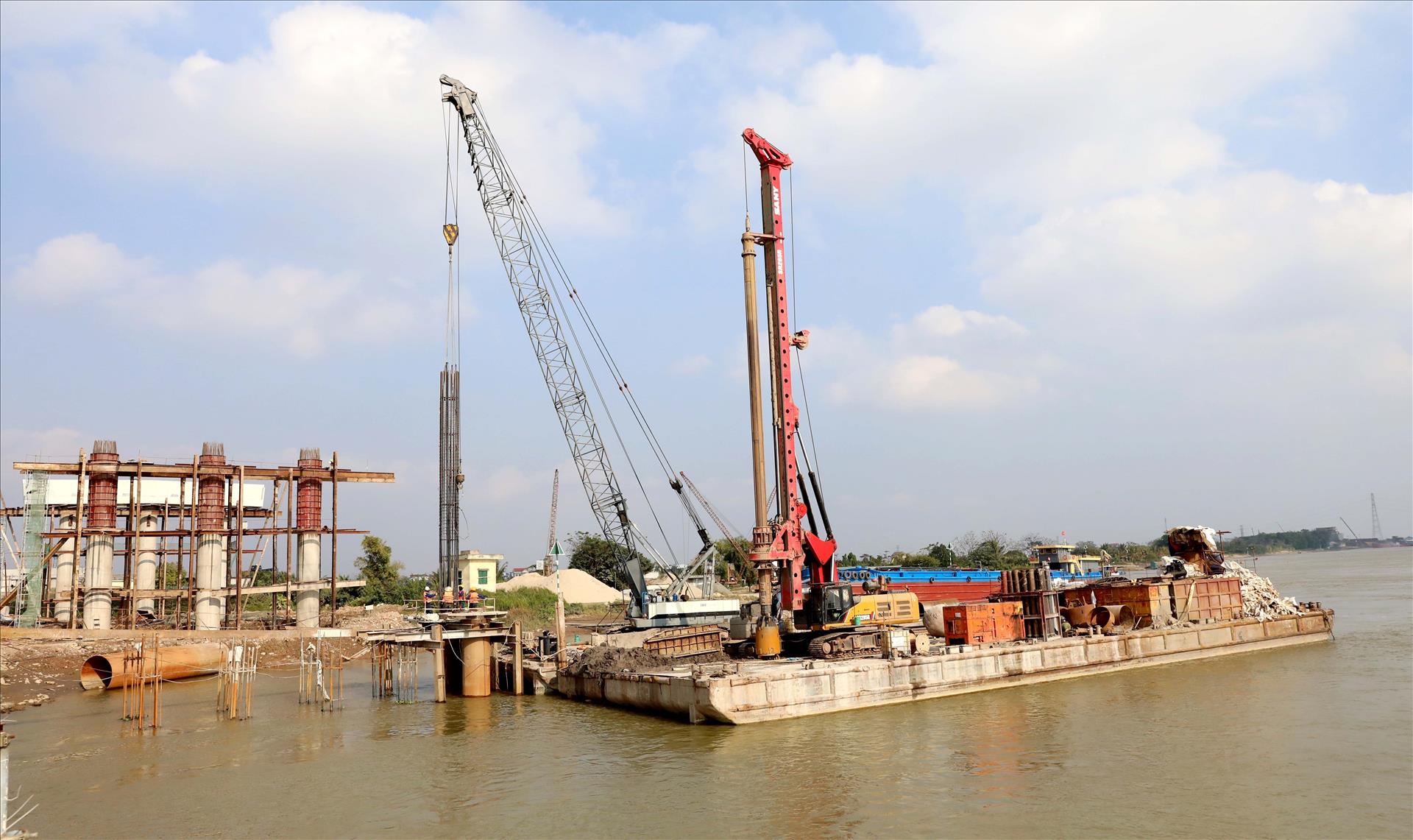 Cầu vượt sông Hồng nối hai tỉnh Hưng Yên - Ninh Bình thuộc dự án đường cao tốc CT.08 được các đơn vị khẩn trương thi công. Ảnh: Thế Duyệt - TTXVN