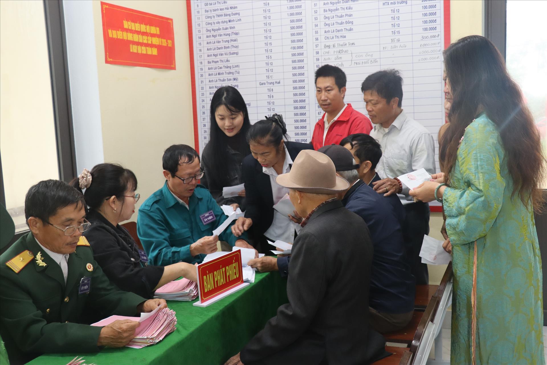 Cử tri thôn 12, xã Thạch Hà nhận phiếu bầu tại bàn phát phiếu. Ảnh: Hoàng Ngà - TTXVN