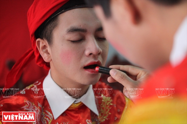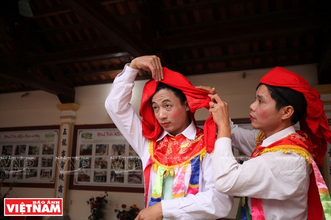 Những nam thanh niên mặc váy, vận yếm đào, trang điểm khăn mỏ quạ chuẩn bị vào hội. Ảnh: Công Đạt