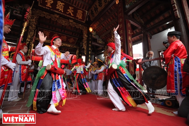 Khi bên trong các bậc cao niên dâng rượu đức Thành hoàng làng thì bên ngoài biểu diễn múa bồng, cứ ba tuần rượu là ba lần múa. Ảnh: Công Đạt
