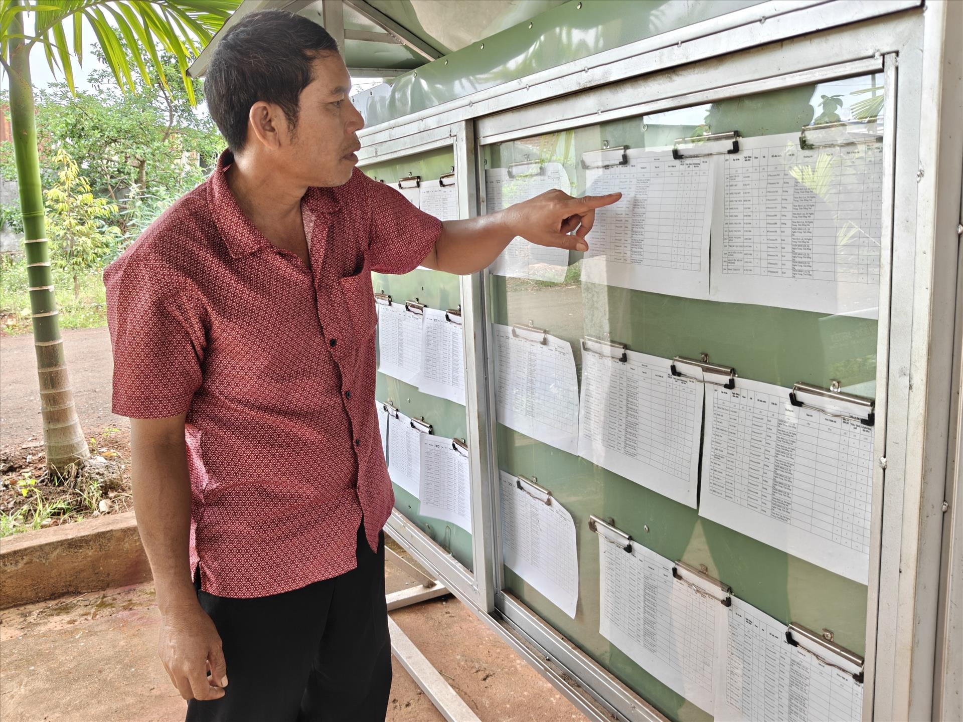 Trưởng thôn Điểu Xu xem thông tin danh sách cử tri tại nhà văn hóa thôn Bình Lợi. Ảnh: K GỬIH-TTXVN