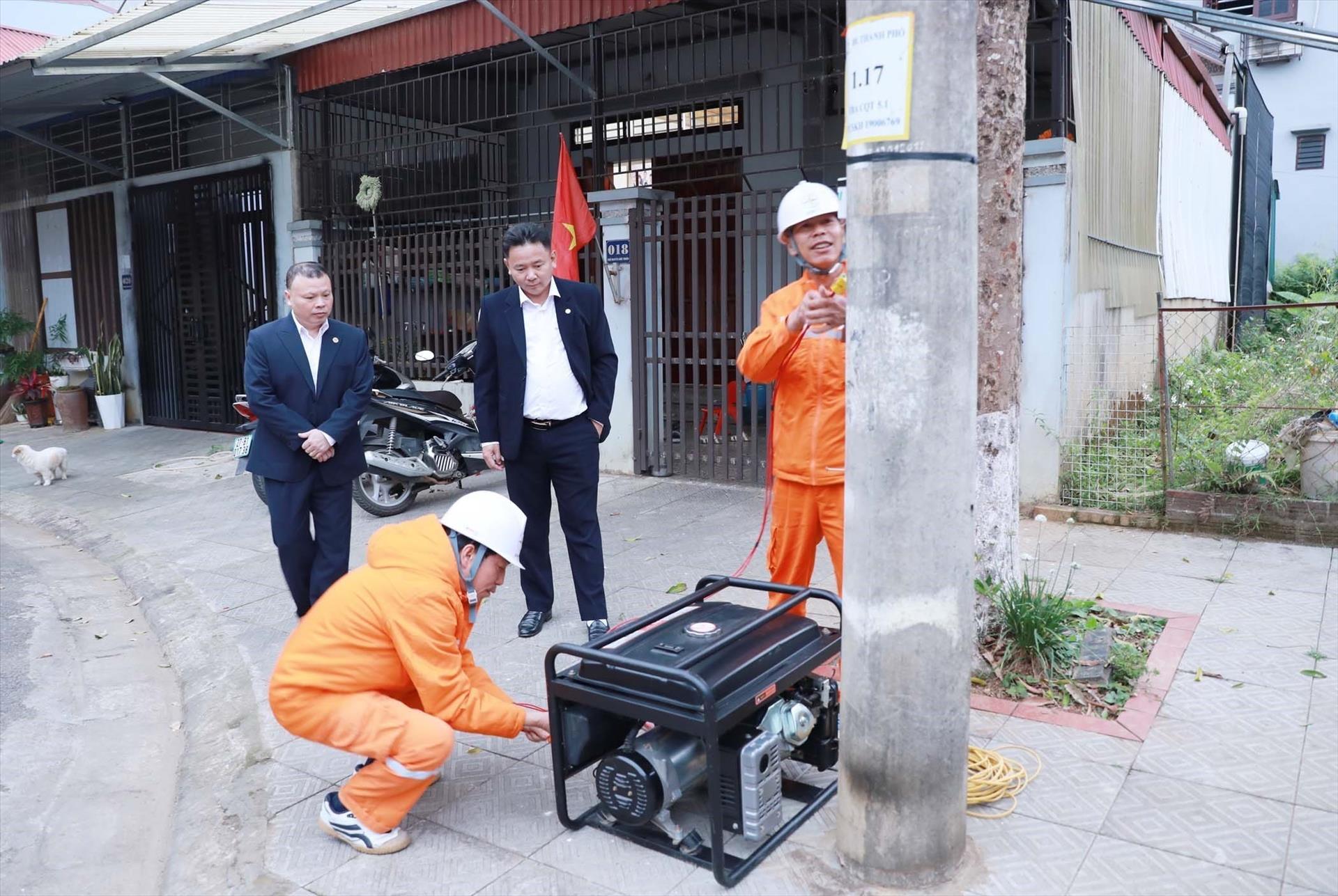 Lãnh đạo Công ty Điện lực Lai Châu cùng cán bộ kỹ thuật kiểm tra phương án dự phòng bằng máy phát điện phục vụ cho ngày bầu cử tại tổ dân cư số 16, phường Tân Phong. Ảnh: Quý Trung – TTXVN