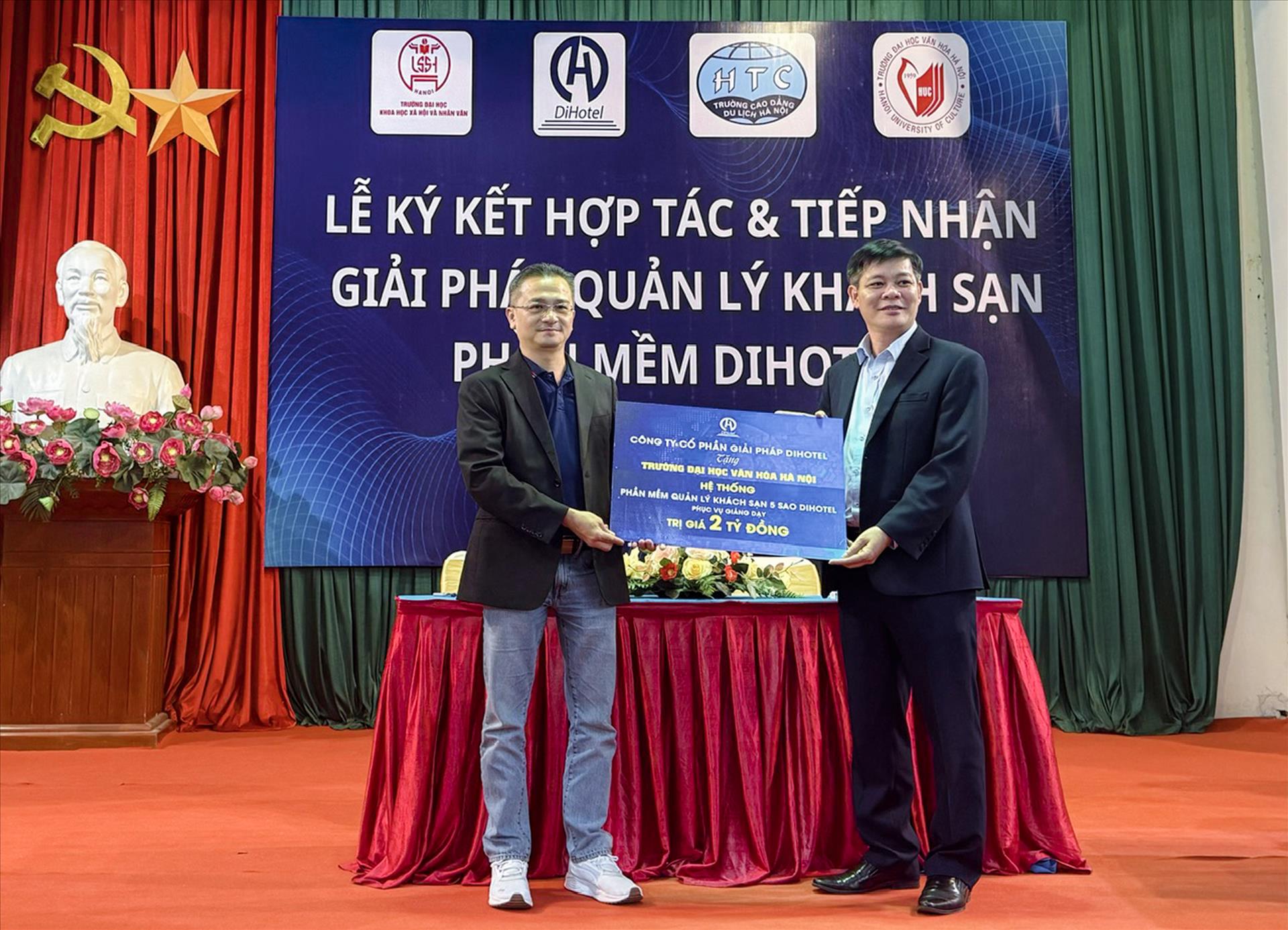 Ông Nguyễn Vĩnh Tâm, CHủ tịch HĐQT Dihotel trao tặng phần mềm cho trường đại học Văn hóa Hà Nội.