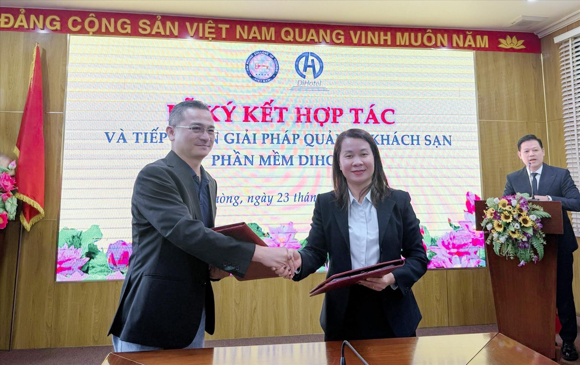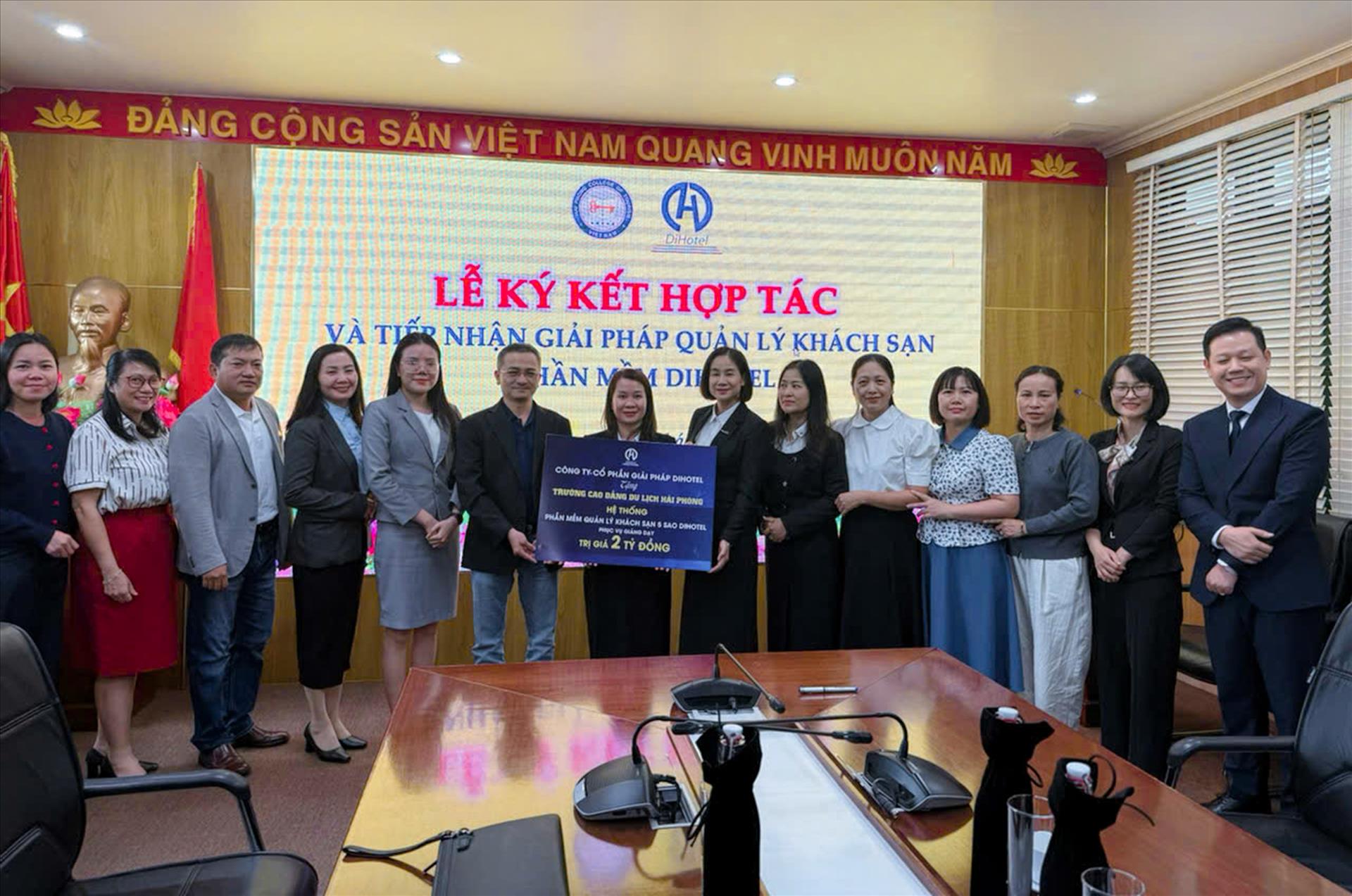 Ông Nguyễn Vĩnh Tâm, CHủ tịch HĐQT Dihotel trao tặng phần mềm trị già 02 tỷ đồng cho trường Cao đẳng du lịch Hải Phòng.