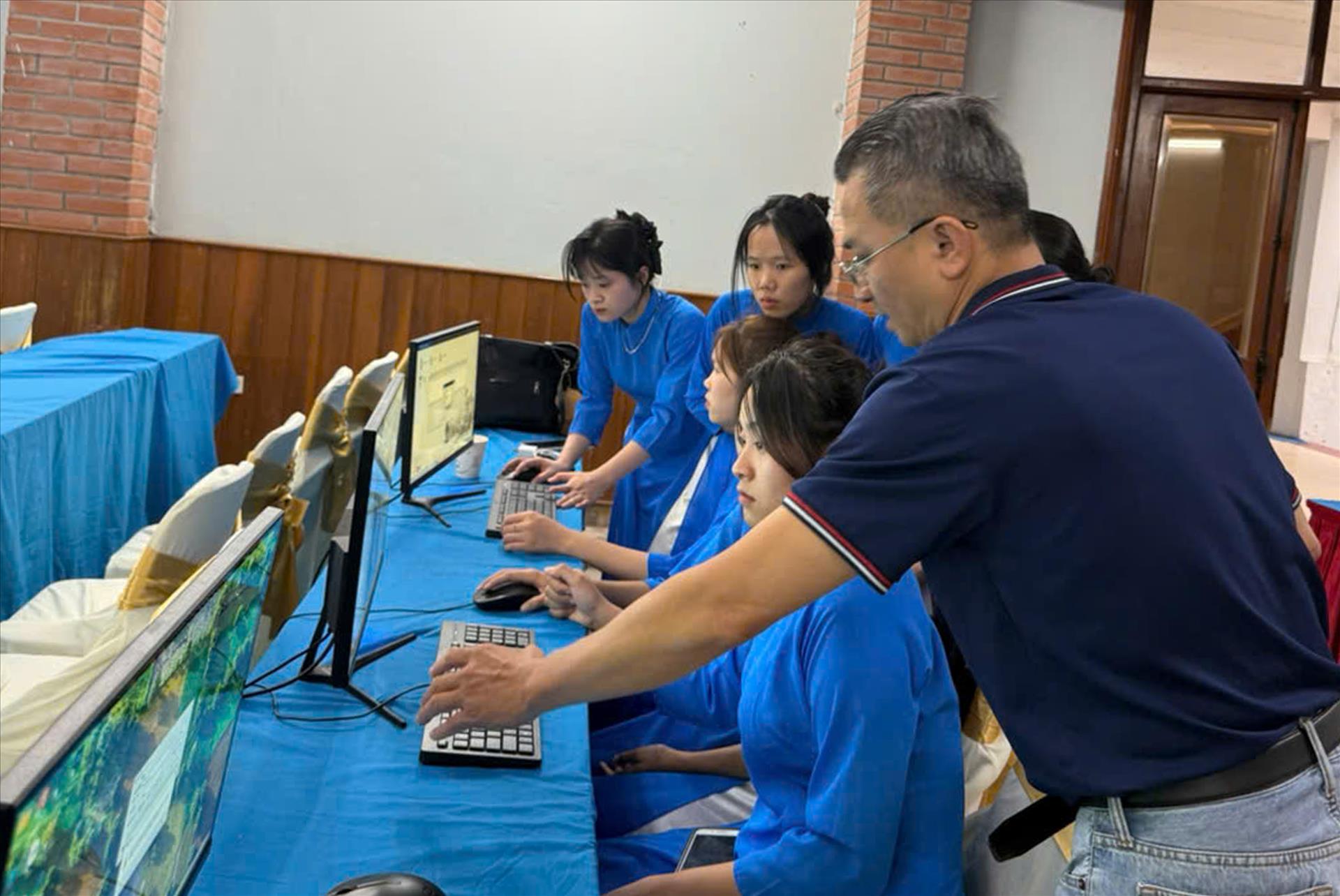 Ông Nguyễn Vĩnh Tâm, CHủ tịch HĐQT Dihotel trực tiếp hướng dẫn sinh viên trường cao đẳng du lịch Hà Nội sử dụng phần mềm.