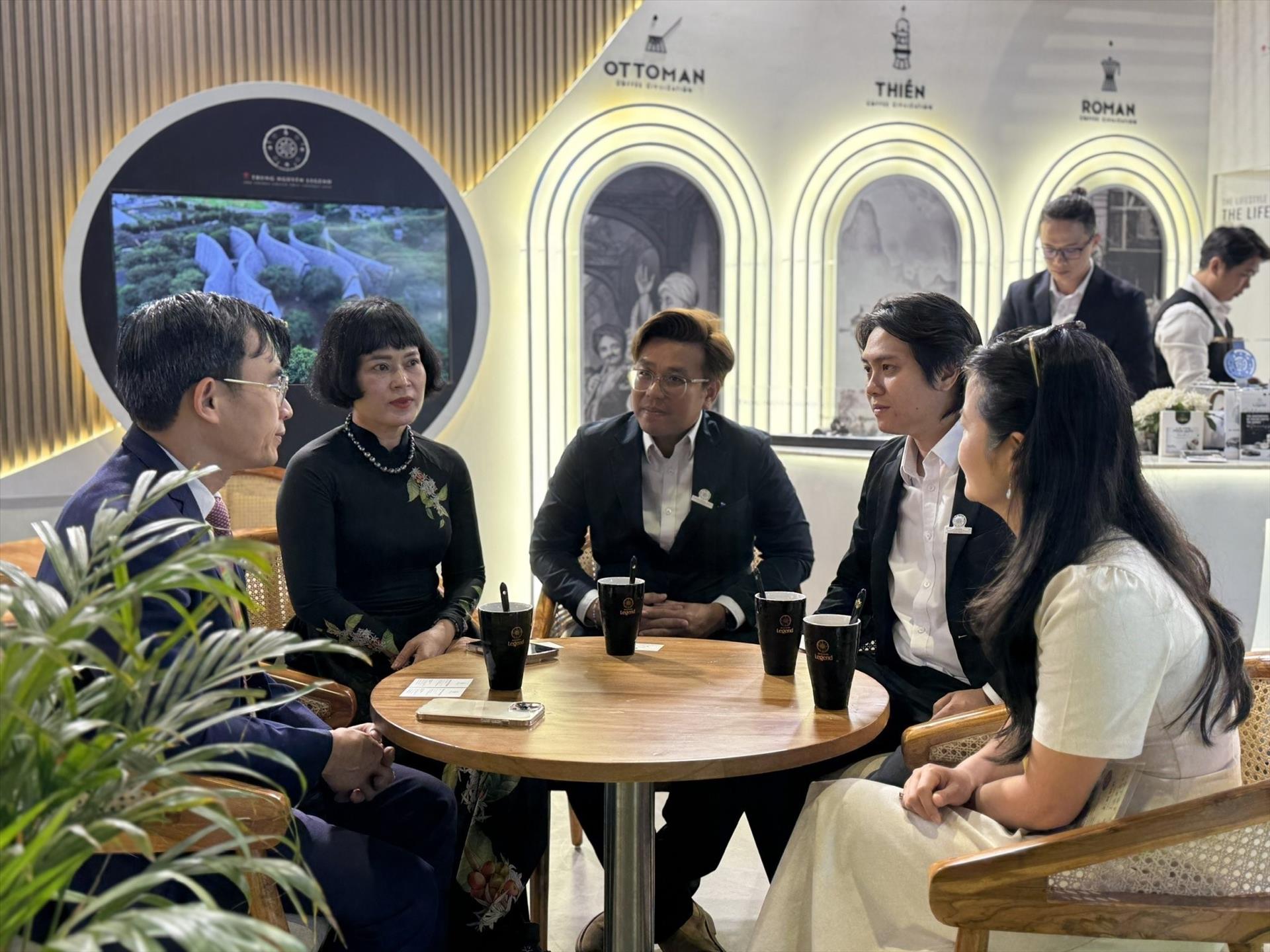 Tham tán Thương mại Việt Nam tại Ấn Độ Bùi Trung Thướng trao đổi với đại diện Tập đoàn Trung Nguyên Legend. Ảnh: Quang Trung - PV TTXVN tại Ấn Độ
