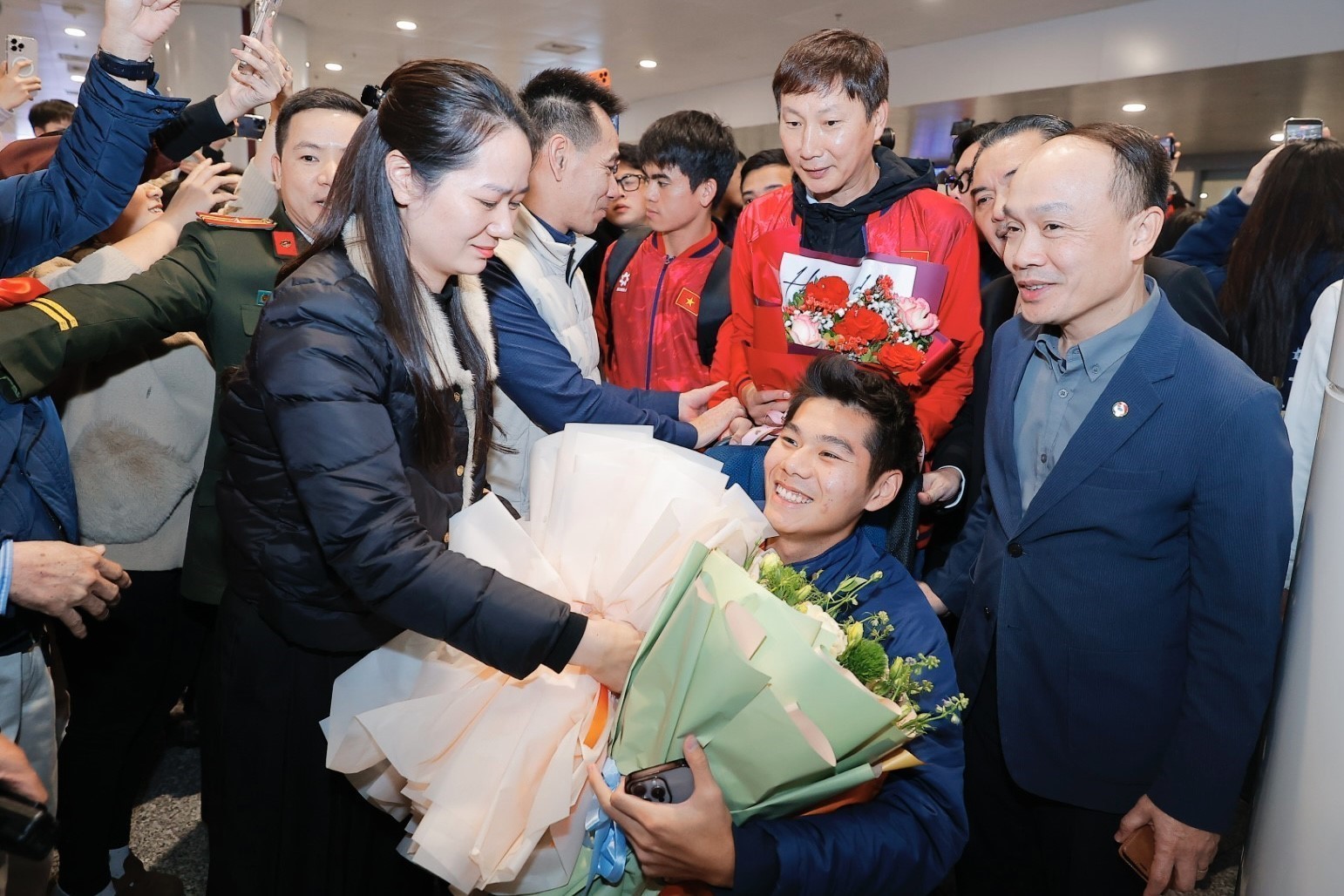 Người thân tặng hoa cầu thủ Hiểu Minh tại sân bay Nội Bài (Hà Nội). Ảnh: Minh Quyết - TTXVN