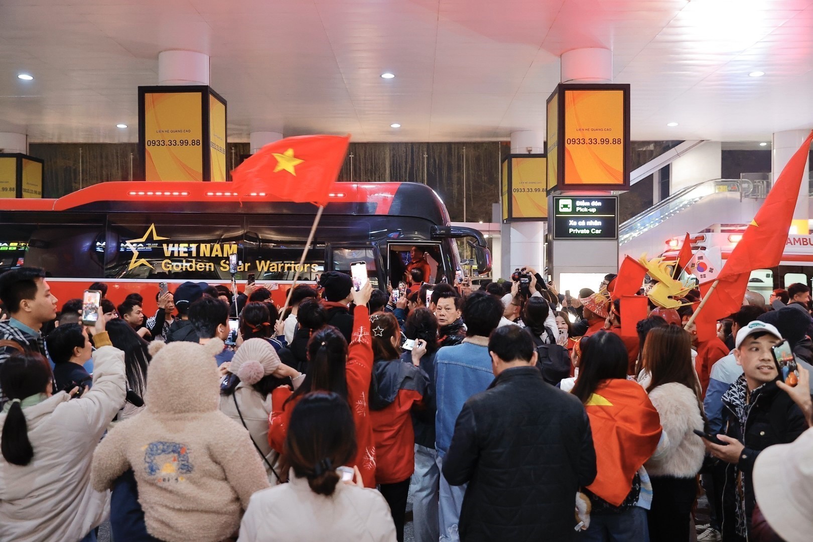 Các thành viên đội tuyển U23 Việt Nam sau ít phút chụp ảnh, ký tặng cổ động viên đã lên xe trở về Liên đoàn Bóng đá Việt Nam để nghỉ ngơi.