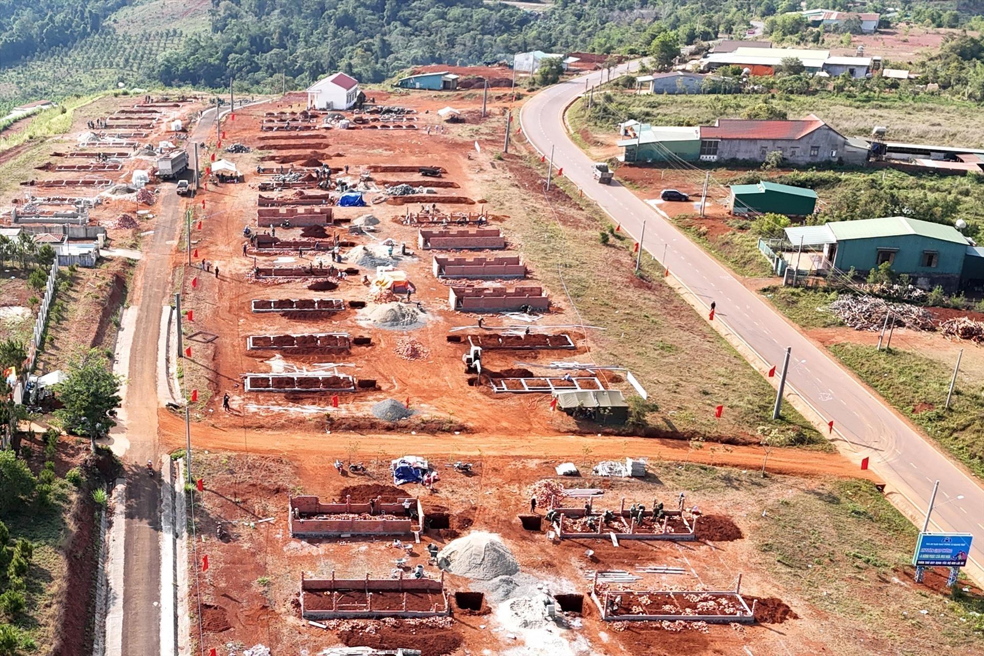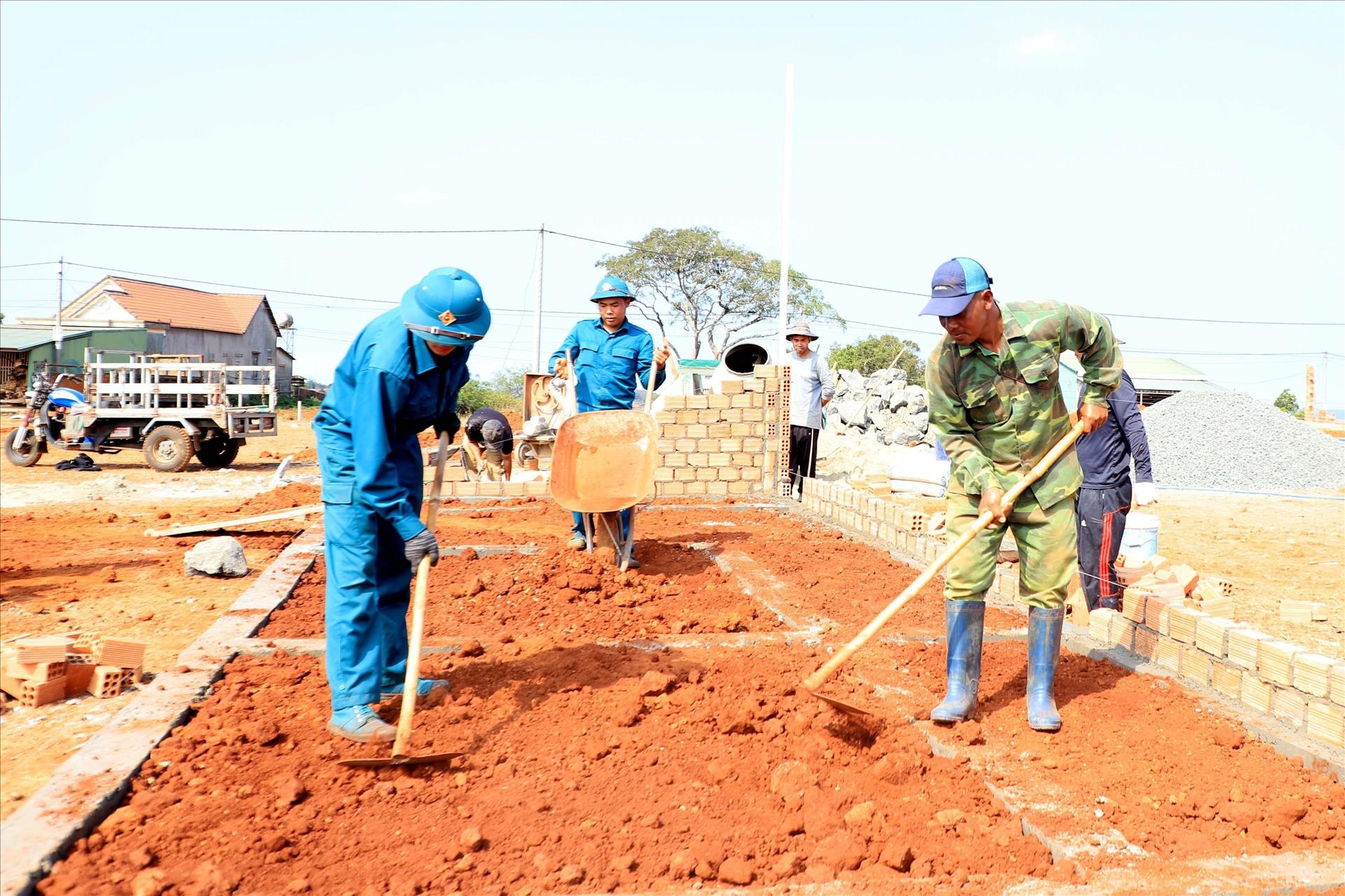 Dưới cái nắng gay gắt của vùng biên, gần 200 nhân công, trong đó, phần lớn là cán bộ, chiến sỹ và dân quân thường trực thuộc Bộ Chỉ huy Quân sự tỉnh Lâm Đồng đang tập trung đào đắp đất, đổ móng, xây tường...