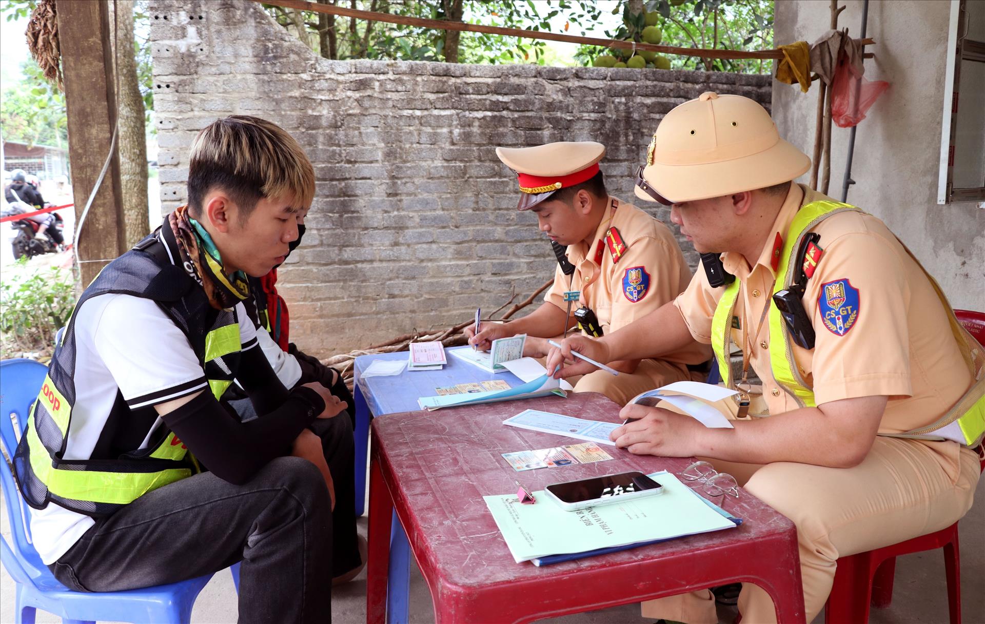 Lực lượng CSGT Công an tỉnh Tuyên Quang kiểm tra phương tiện, giấy tờ của người tham gia giao thông trên tuyến trọng điểm đi Cao nguyên đá Đồng Văn. Ảnh: Đức Thọ - TTXVN