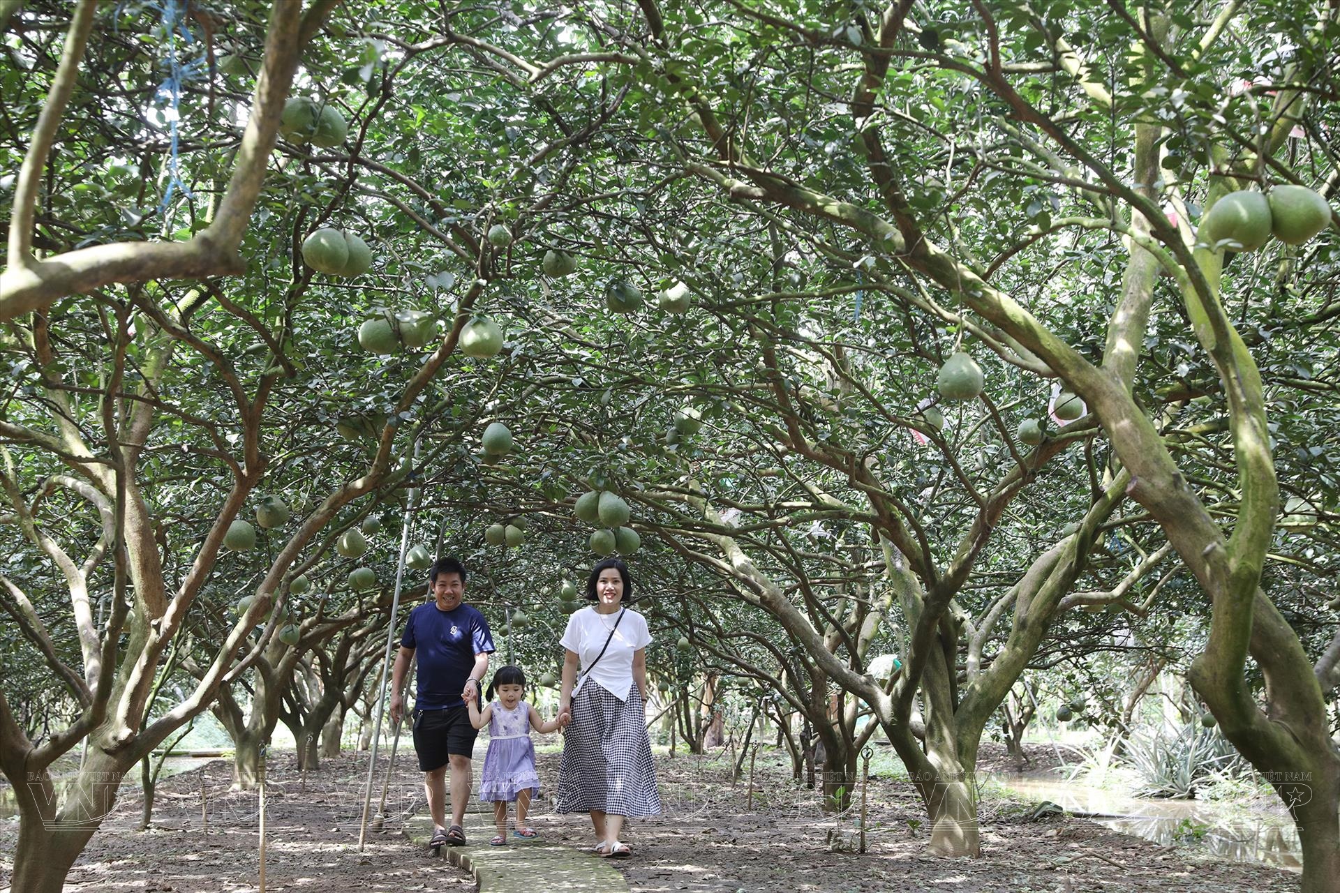 Du khách tham quan vườn bưởi Tân Triều với những chùm trái trĩu cành.