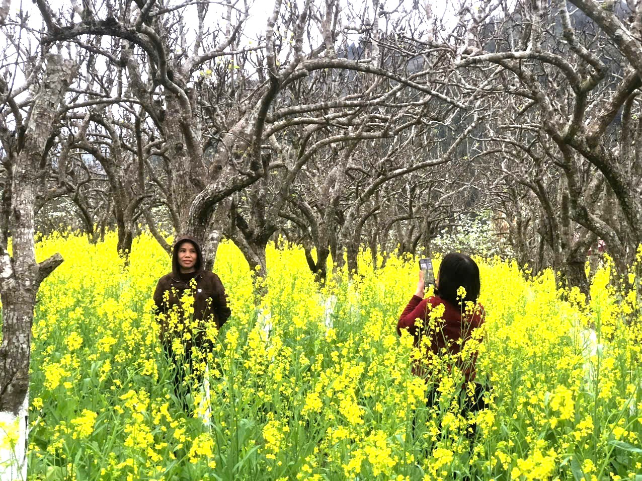 Du khách chek-in vườn hoa cải vàng trồng xen trong những gốc lê, gốc hồng cổ thụ.