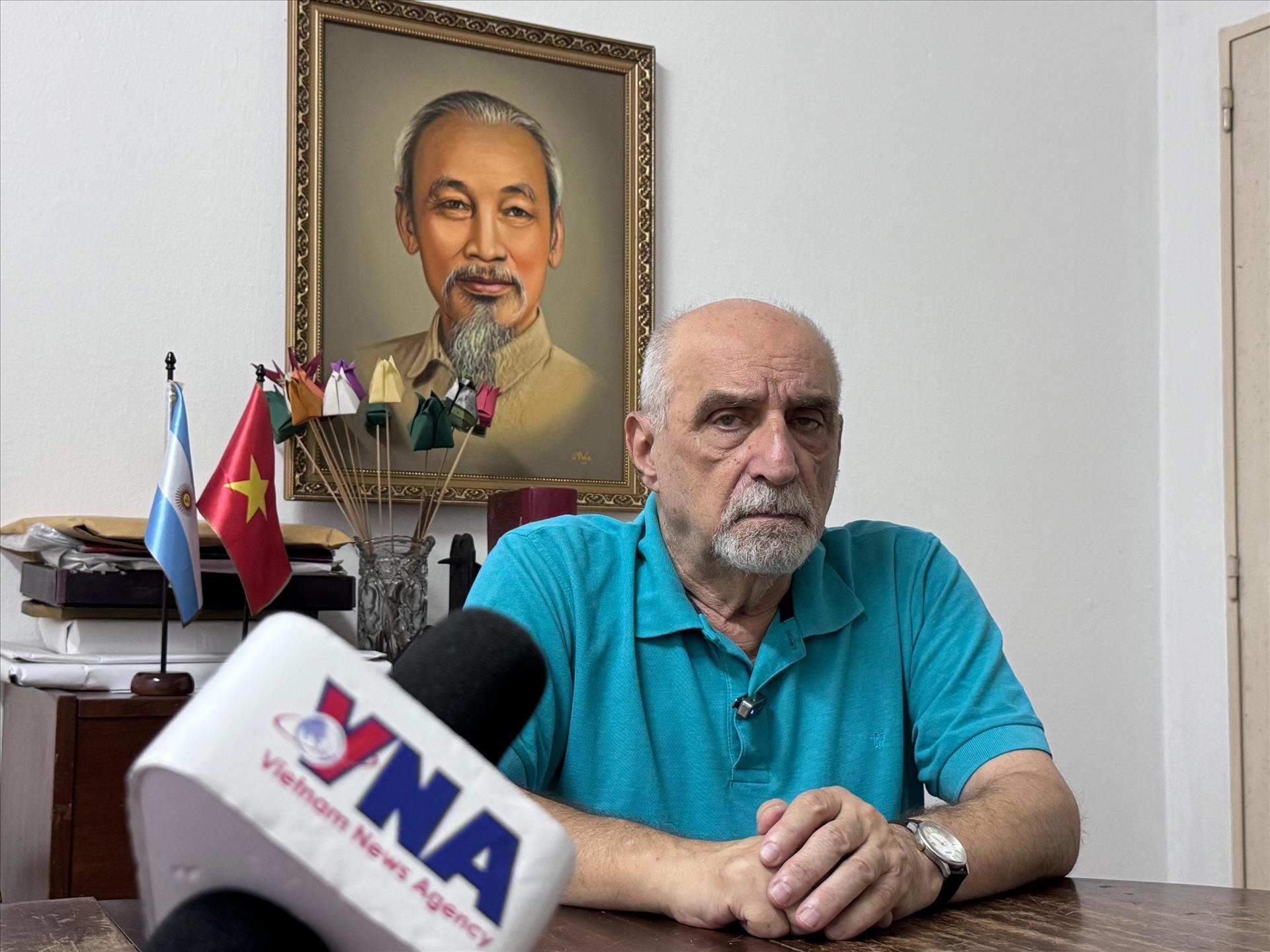 Tổng Bí thư Đảng Cộng sản Argentina Jorge Kneneyss trả lời phỏng vấn phóng viên TTXVN tại Argentina. Ảnh: Diệu Hương - PV TTXVN tại Argentina