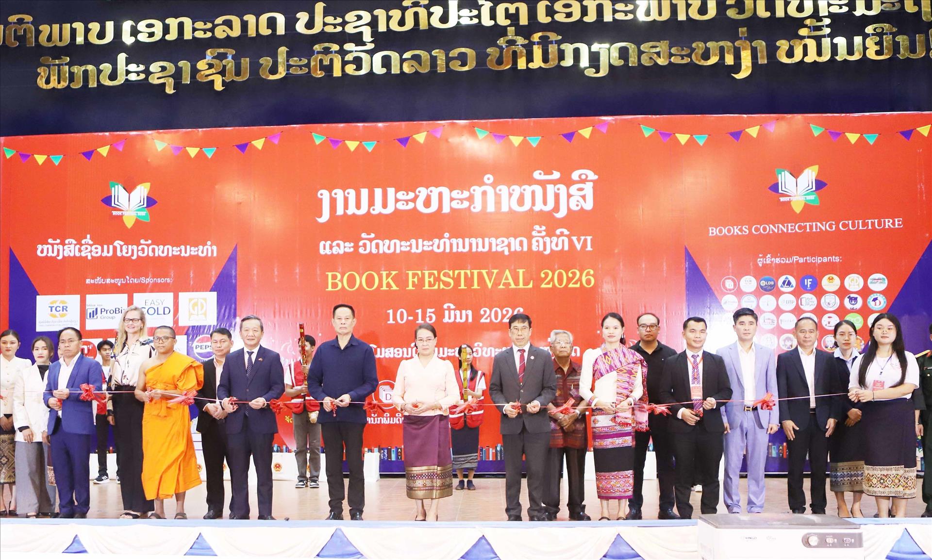 Đại sứ Việt Nam tại Lào Nguyễn Minh Tâm cùng các đại biểu tham dự sự kiện cắt băng khai mạc Lễ hội Sách và Văn hóa quốc tế lần thứ VI. Ảnh: Xuân Tú - PV TTXVN tại Lào