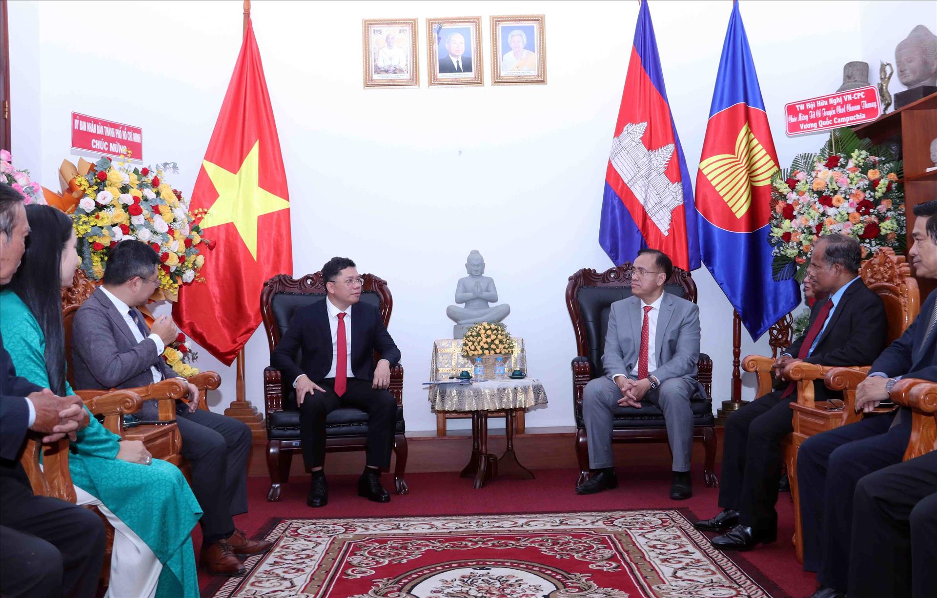 Ông Hoàng Nguyên Dinh (trái), Phó Chủ tịch UBND Thành phố Hồ Chí Minh chúc mừng Tổng lãnh sự quán Campuchia tại Thành phố Hồ Chí Minh nhân dịp Tết cổ truyền của nhân dân Campuchia. Ảnh: Xuân Khu-TTXVN