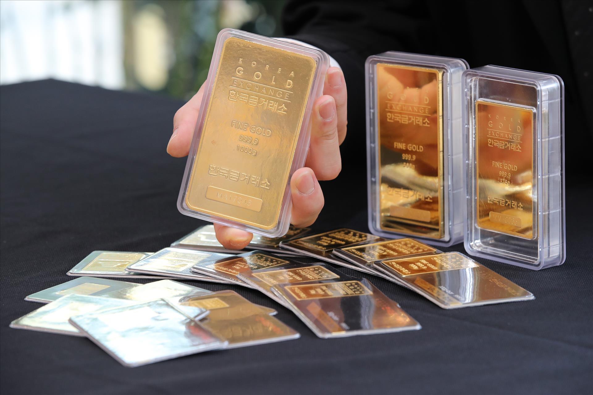 Vàng miếng được bày bán tại sàn giao dịch ở Seoul, Hàn Quốc. Ảnh: Yonhap/TTXVN