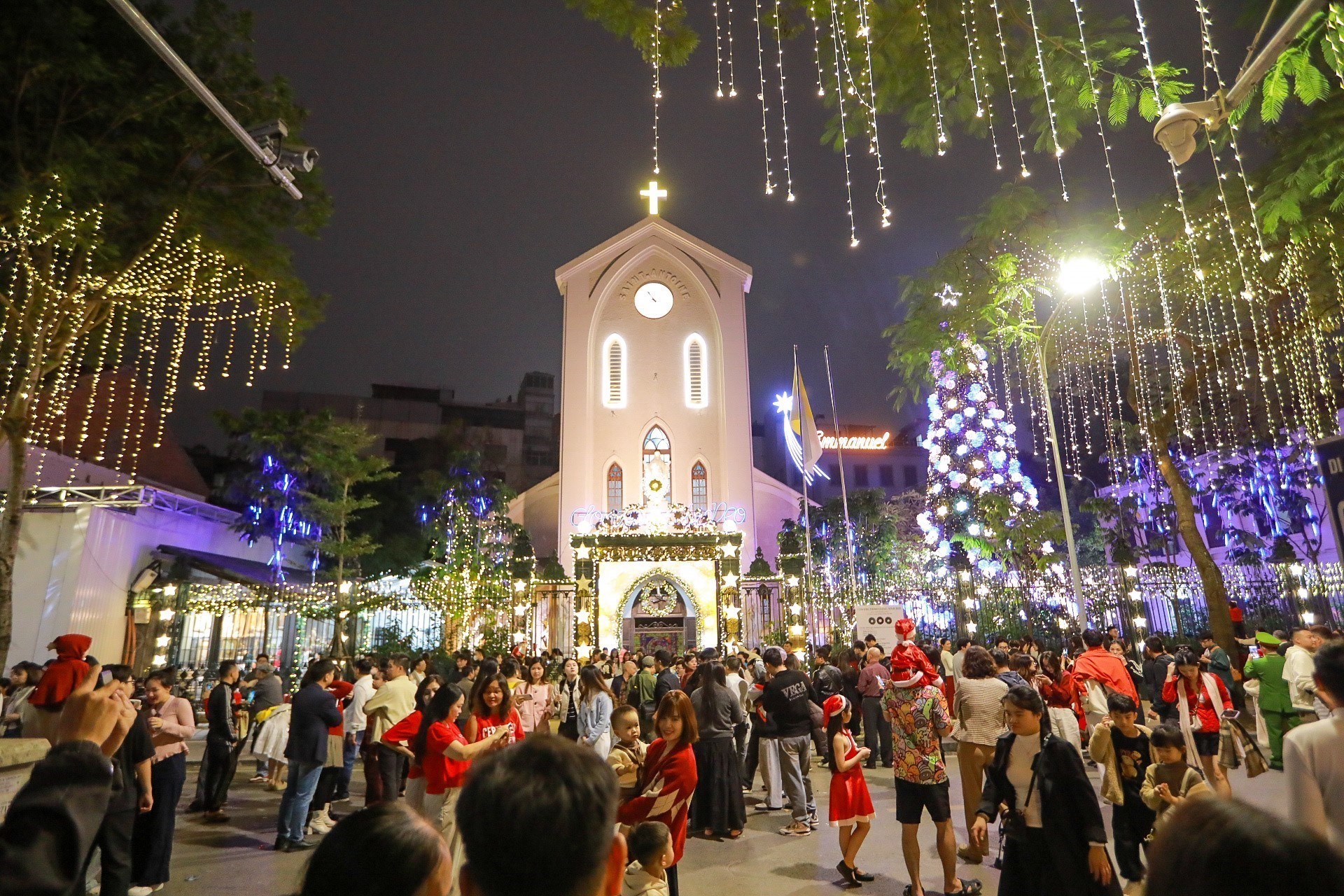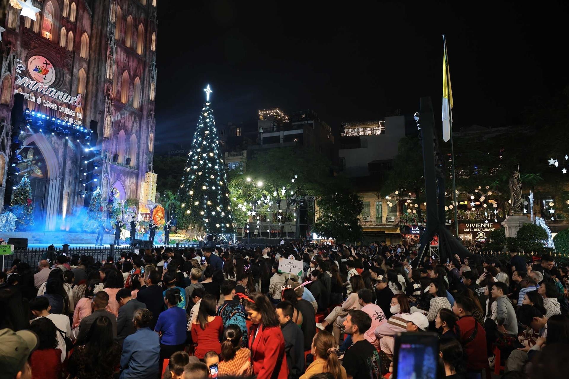 Khu vực Nhà thờ Lớn Hà Nội tiếp tục là điểm hẹn quen thuộc trong đêm Giáng sinh. Ngay từ đầu giờ tối, rất đông người dân và du khách đã tập trung quanh khuôn viên nhà thờ để hòa mình vào không khí lễ hội. Dưới ánh đèn vàng ấm áp, những bản thánh ca vang lên, tạo nên khoảnh khắc vừa thiêng liêng, vừa gần gũi.