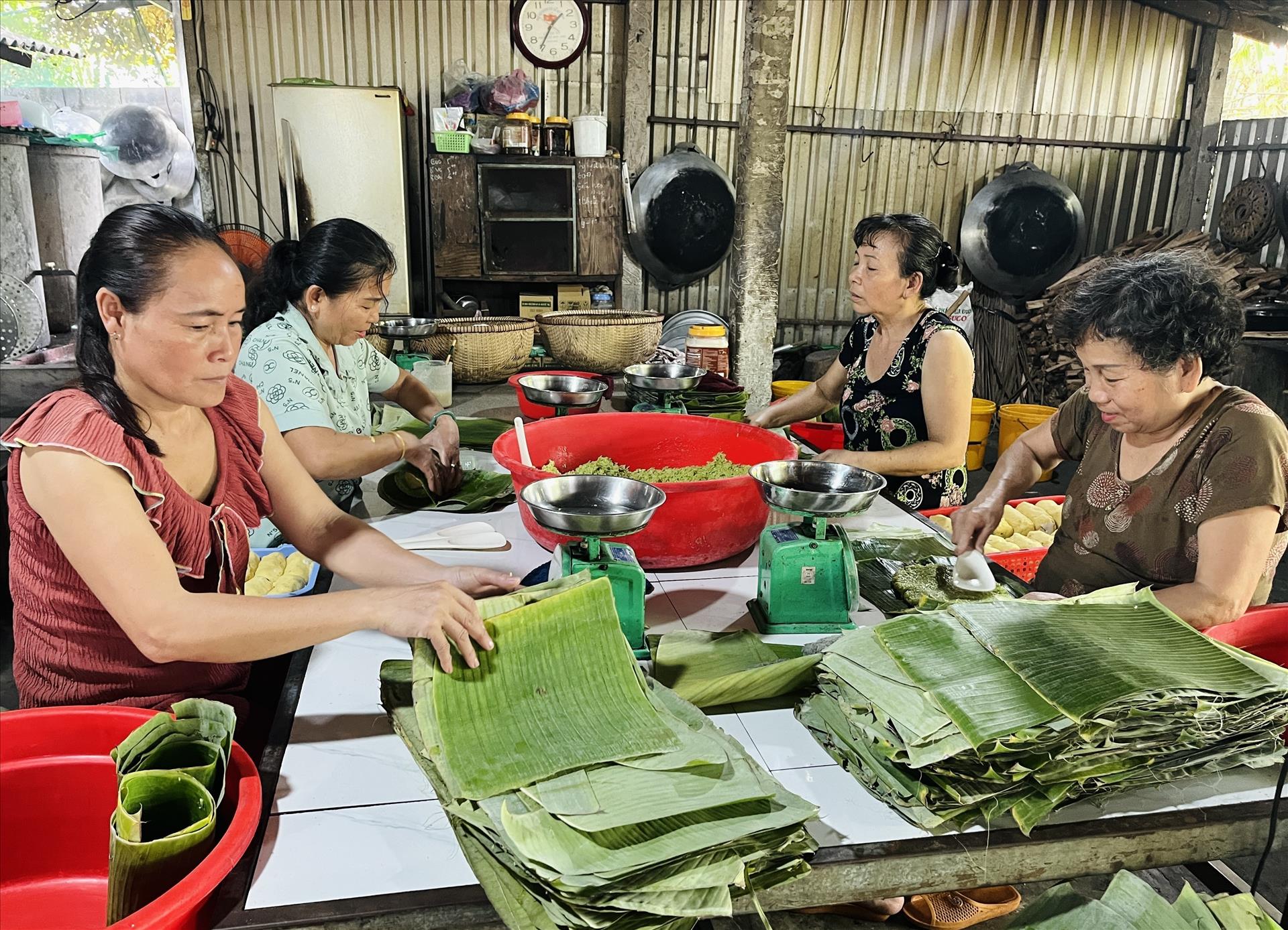 Từ khoảng 15 tháng Chạp, xưởng bánh sáng đèn liên tục. Lò hấp đỏ lửa từ sáng đến khuya để kịp đơn hàng tăng mạnh. Ngày thường, cơ sở duy trì 4–5 lao động; cao điểm từ 20 tháng Chạp đến mồng 2 Tết, nhân công tăng lên 50–70 người, có thời điểm 100 người. Trung bình mỗi ngày xuất xưởng khoảng 5.000 đòn bánh. Dịp Tết năm nay, dự kiến cơ sở sử dụng hết khoảng 7 tấn nếp.