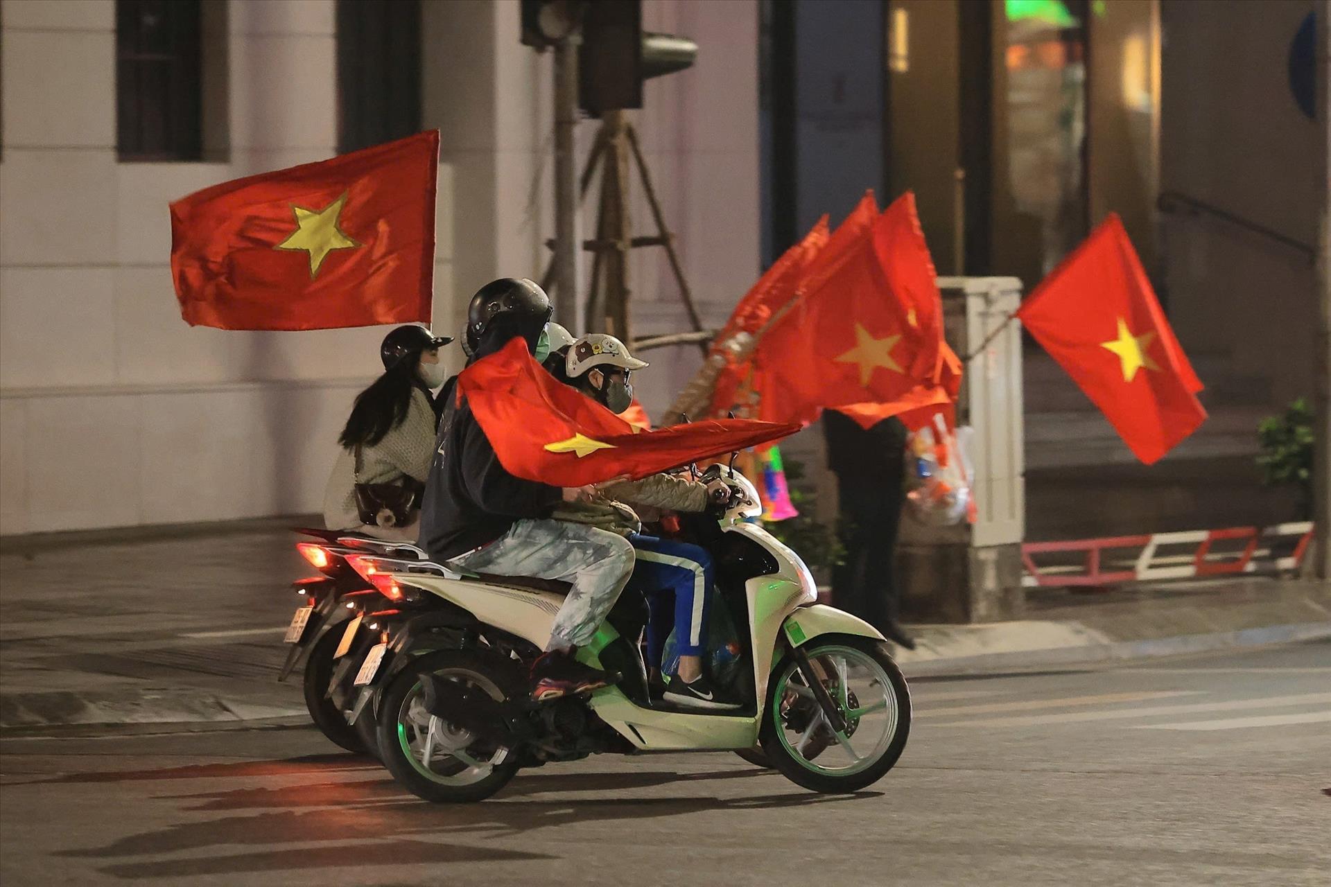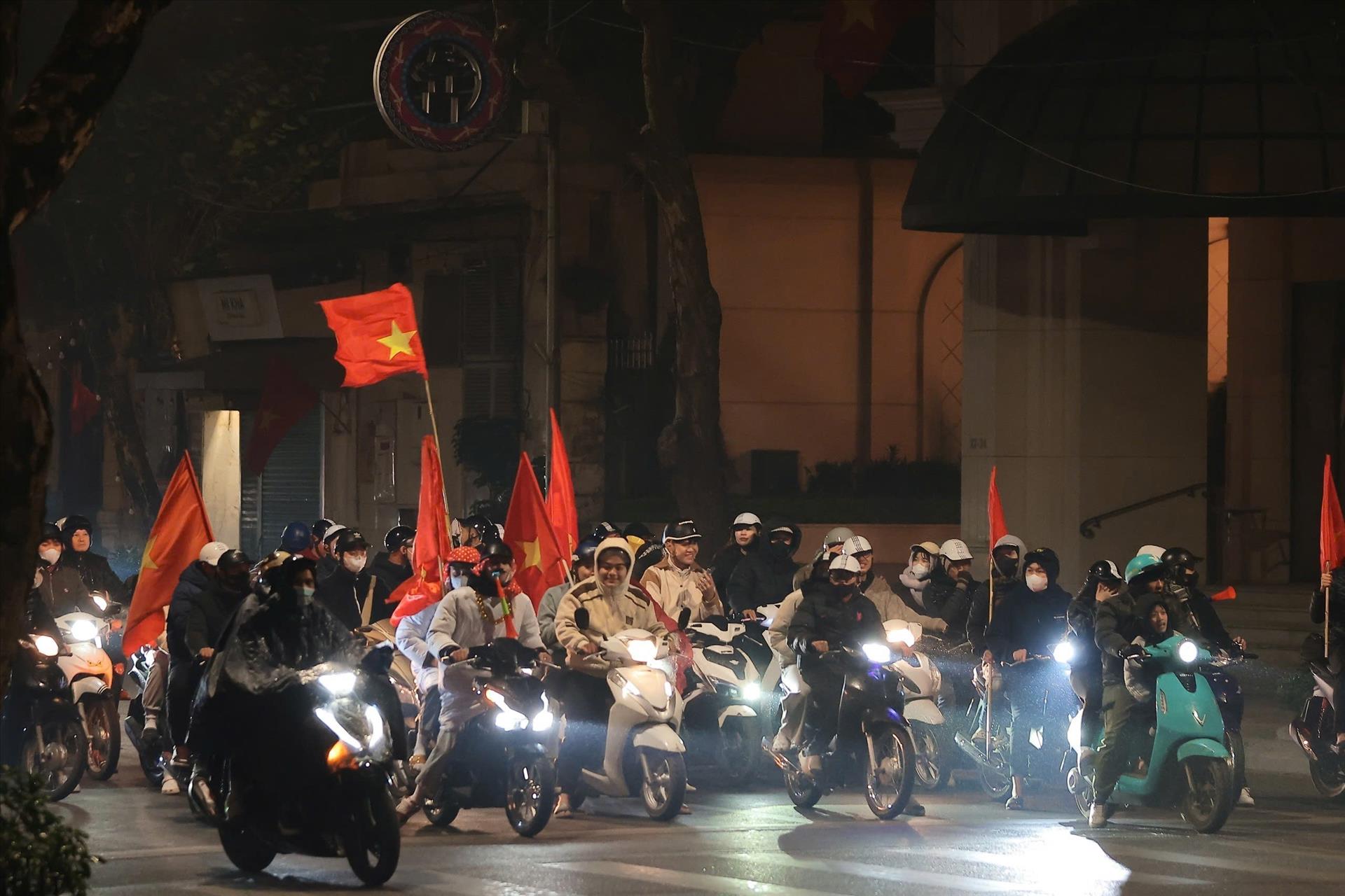 Đã 1h30 sáng, người hâm mộ Thủ đô vẫn đổ ra đường ăn mừng chiến thắng tuyệt vời của U23 Việt Nam. Ảnh: Hoàng Hiếu - TTXVN