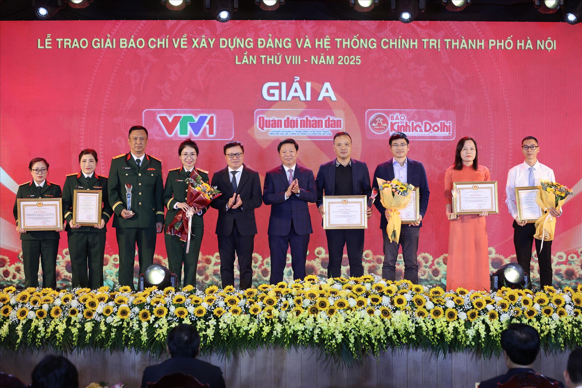 Đại diện các tác giả, nhóm tác giả đến từ VTV1, Báo Quân đội Nhân dân, Báo Kinh tế & Đô thị nhận giải A tại buổi lễ. Ảnh: Công Đạt/Báo ảnh Việt Nam