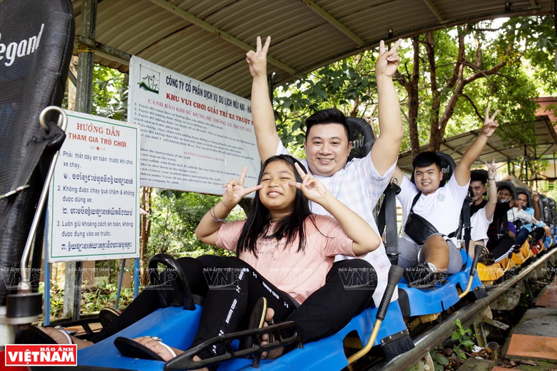 Du khách trẻ trải nghiệm trò chơi xe trượt núi tại Mũi Nai, mang đến cảm giác mạnh giữa khung cảnh thiên nhiên biển núi. Ảnh: Đặng Kim Phương