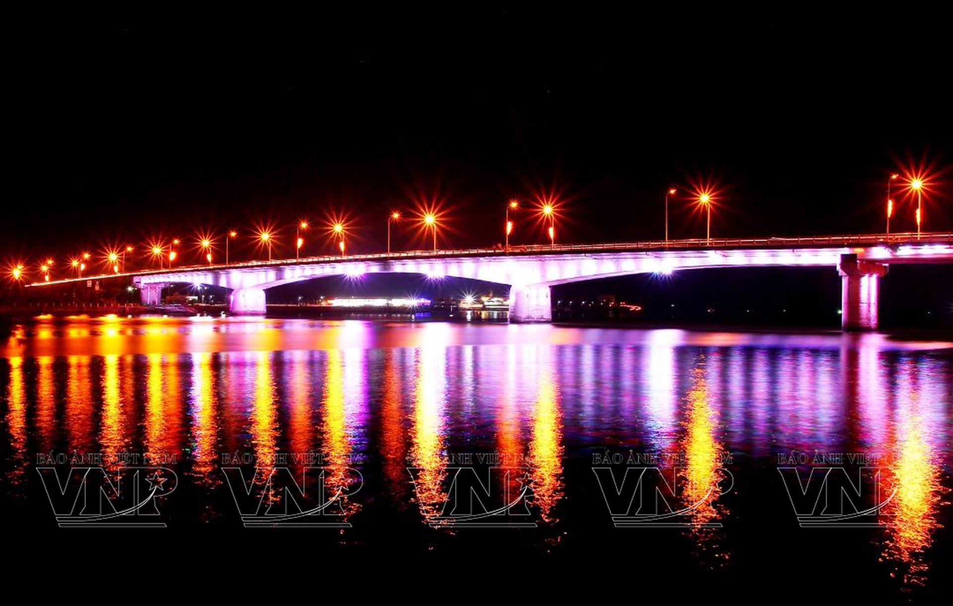 Cầu Tô Châu bắc qua đầm Đông Hồ rực rỡ ánh đèn về đêm, tạo điểm nhấn cho không gian đô thị Hà Tiên. Ảnh: Đặng Kim Phương