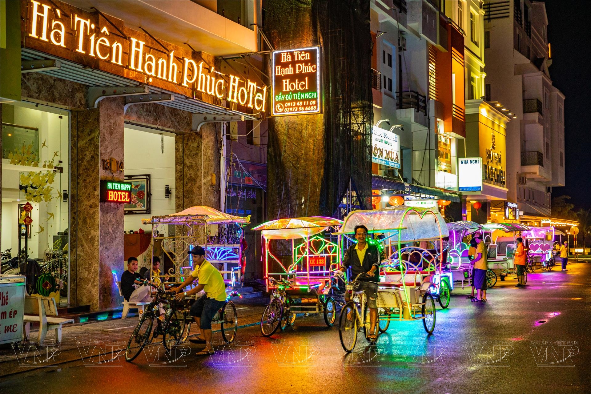 Xe xích lô điện – phương tiện di chuyển thân thiện, giá rẻ, được nhiều du khách lựa chọn để khám phá Hà Tiên về đêm. Ảnh: Nguyễn Luân/ Báo ảnh Việt Nam