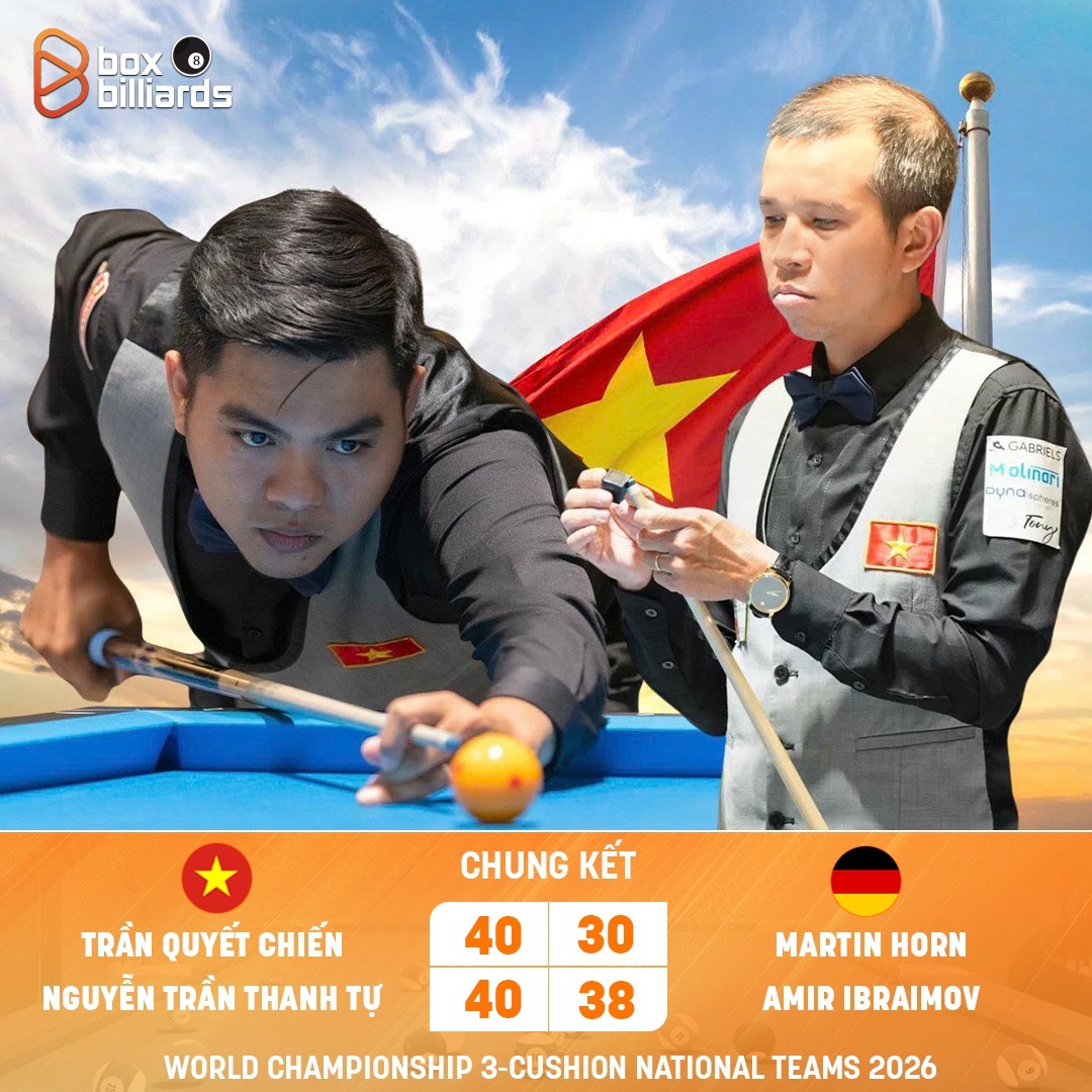 Rạng sáng 2/3, Trần Quyết Chiến và Nguyễn Trần Thanh Tự đã đánh bại đội chủ nhà Đức trong trận chung kết để đăng quang tại Giải billiards carom 3 băng đồng đội thế giới 2026, qua đó lần thứ hai đưa Việt Nam lên ngôi số một thế giới ở nội dung đồng đội.