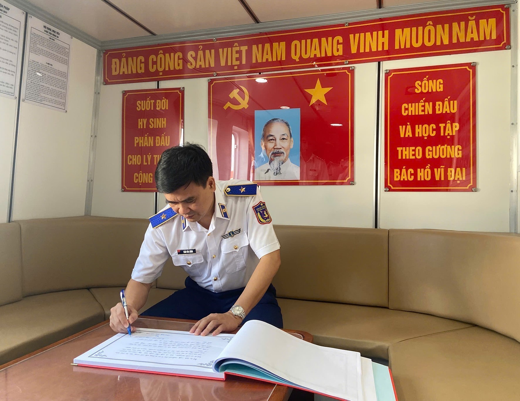 Thiếu tướng Trần Văn Lượng, Phó Tư lệnh, Tham mưu trưởng Cảnh sát biển Việt Nam ghi lưu bút truyền thống trên tàu CSB 4040. Ảnh: TTXVN phát