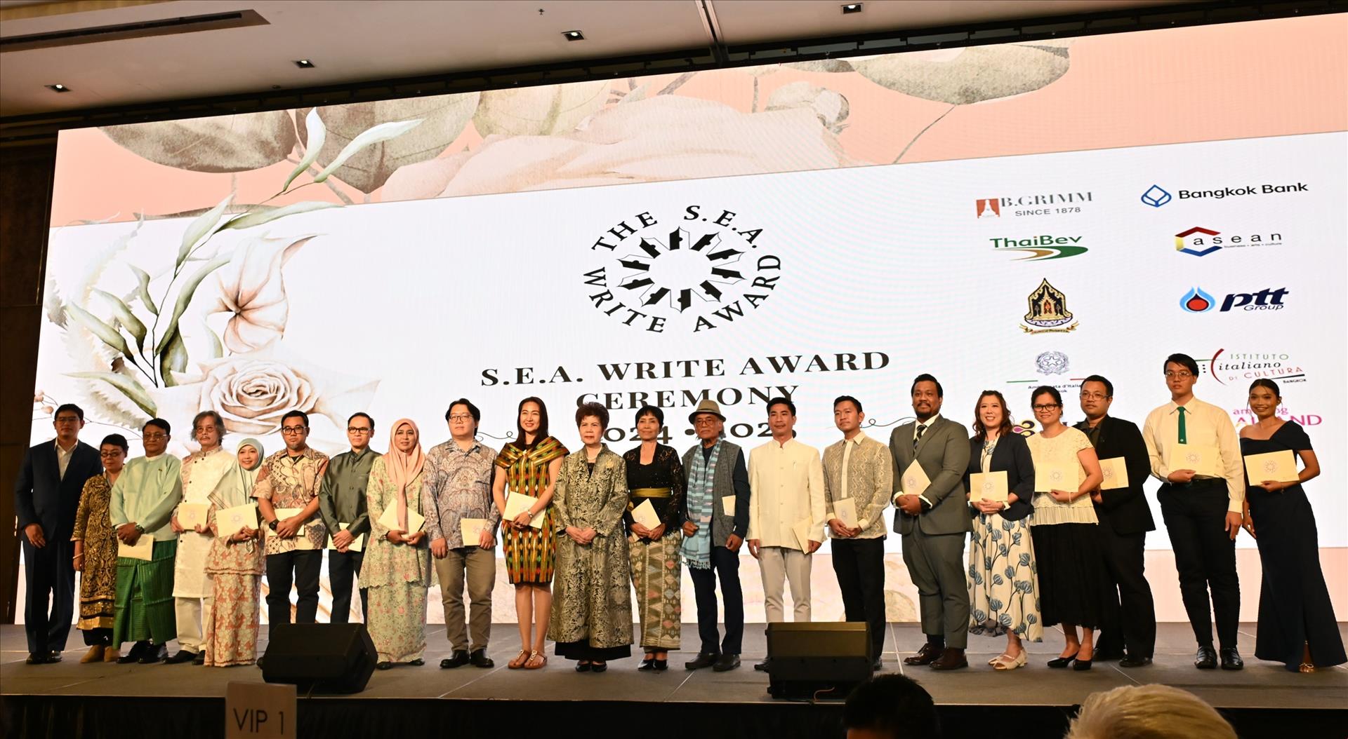 Các nhà văn được vinh danh tại Lễ trao giải thưởng văn học ASEAN 2024-2025. Ảnh: Đỗ Sinh - PV TTXVN tại Thái Lan